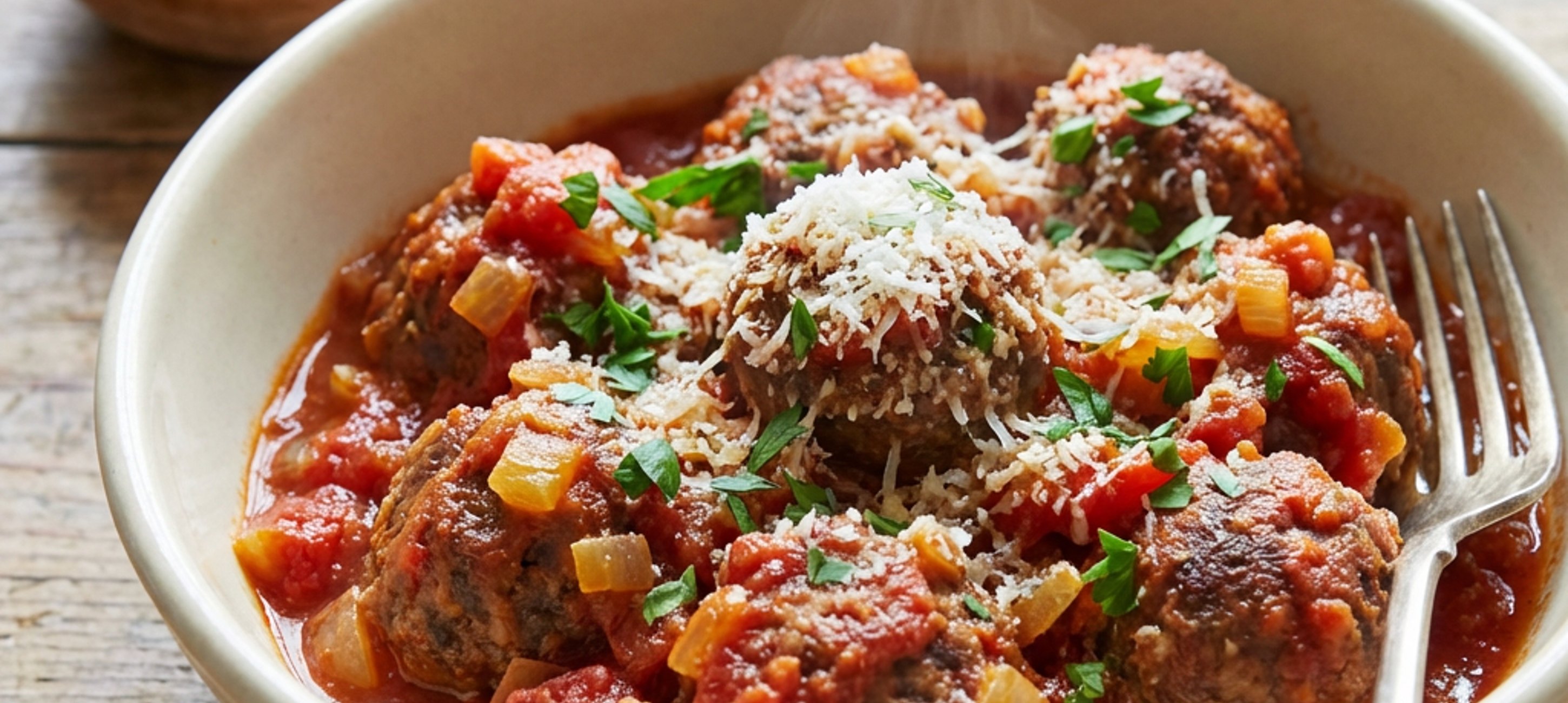 - 1Nejprve v mixéru rozmixujte chléb na malé kousky, přemístěte jej do větší mísy, zalijte smetanou a nechte nasát. Střední cibuli nakrájejte najemno a česnek propasírujte. Cibuli a česnek přidejte do mísy spolu s masem, parmazánem, bazalkou, oreganem a petrželovou natí.