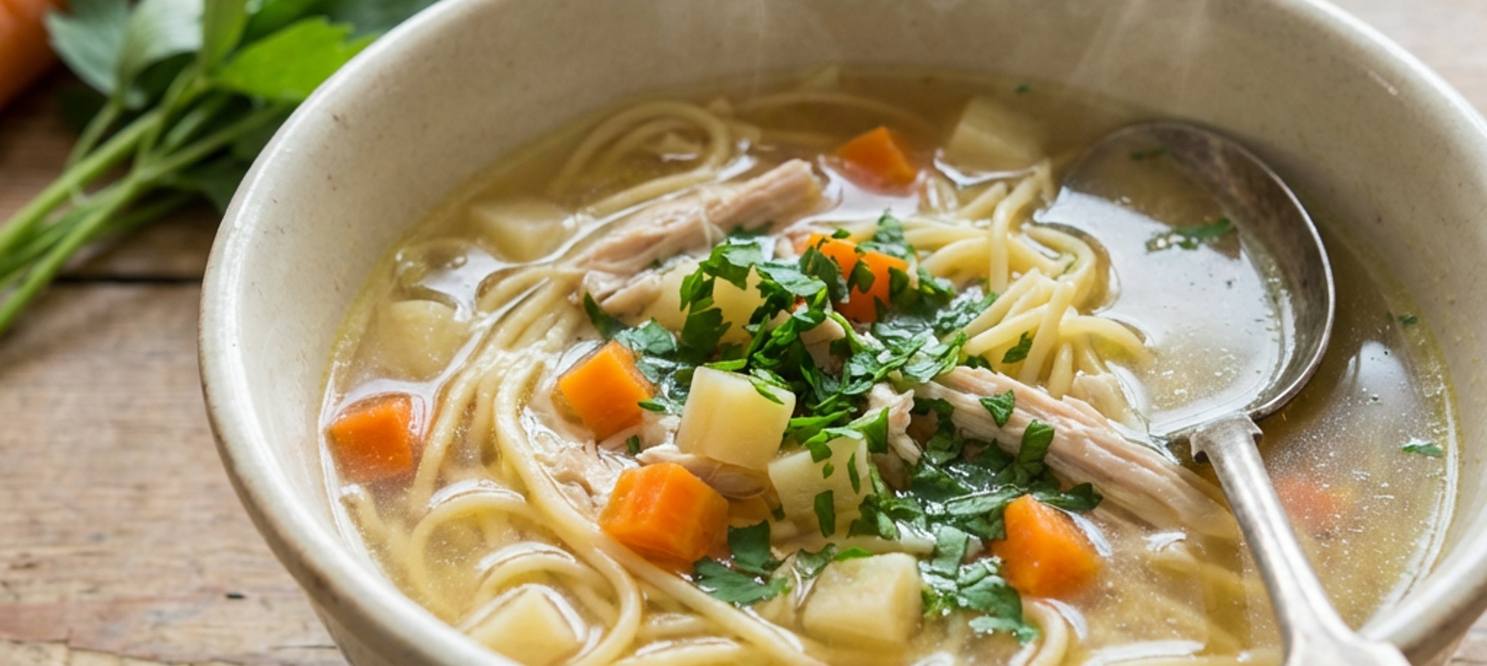 - 5Nyní začněte servírovat polévku: Do hlubokého talíře dejte nudle, přilijte vývar a nakonec jej posypte petrželovou natí.