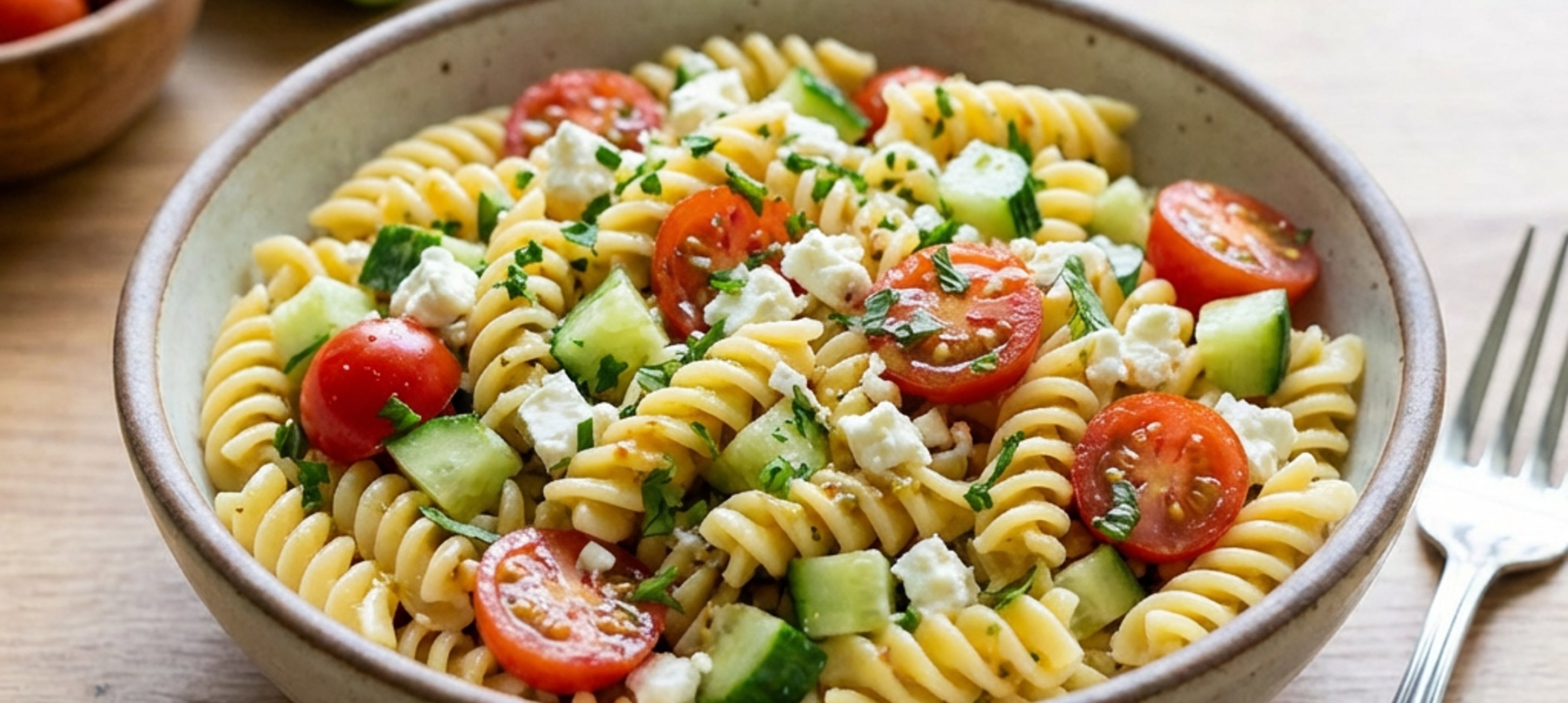 - 4Do mísy k zelenině dejte vychladlé těstoviny a zalijte zálivkou (v množství dle chuti).