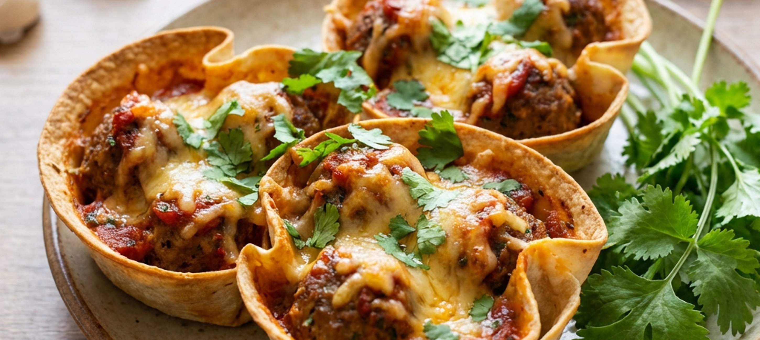 - 3Do větší mísy dejte mleté maso, vejce, cibuli, 50 g goudy, mléko, kmín, chilli, česnek, čerstvý koriandr, sůl, pepř a strouhanku a promíchejte. Z hotové masové směsi vytvořte kuličky o hmotnosti 65–70 g a následně je vložte do košíčků z tortilly.