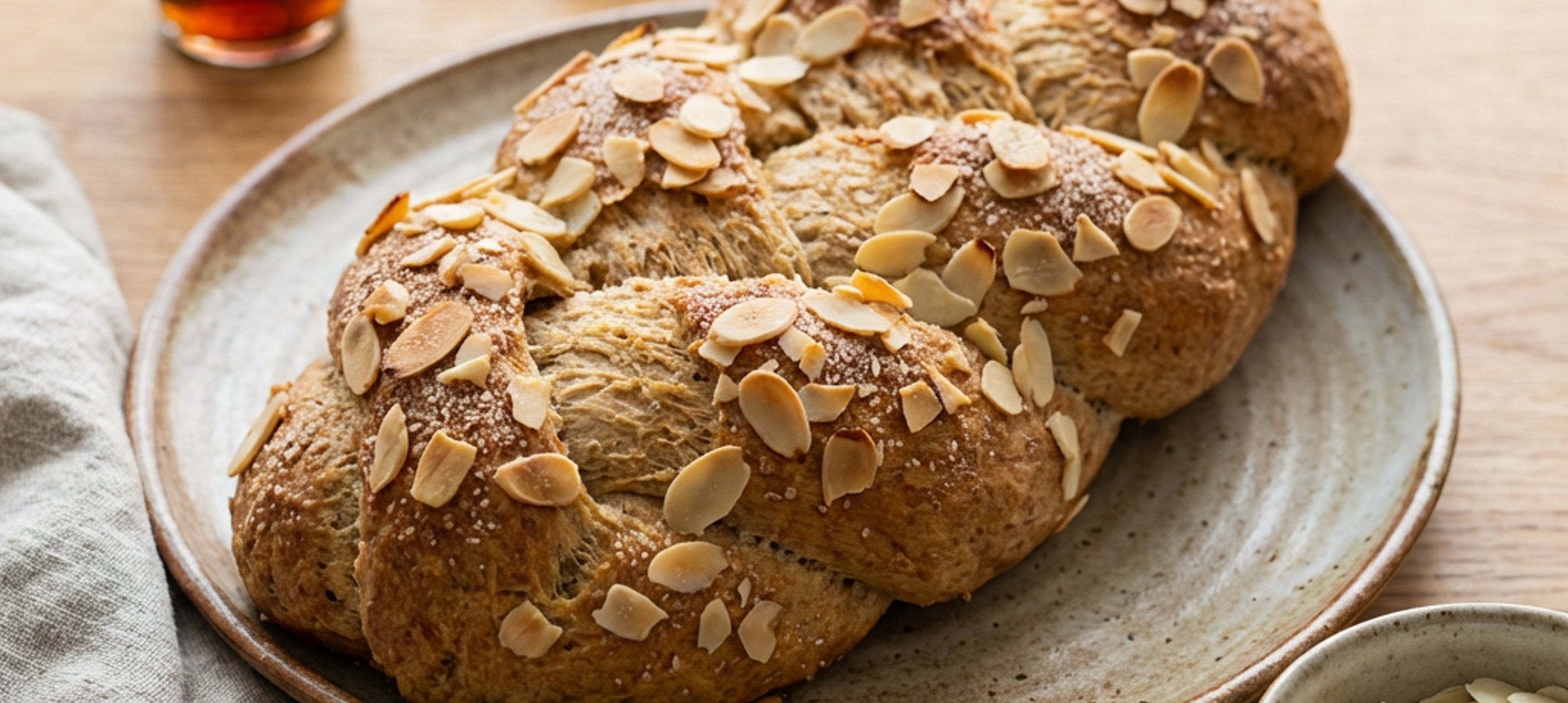 - 6Po 30 minutách kynutí zapneme troubu na horní a dolní ohřev a nastavíme 170 °C. Jakmile je vánočka vykynutá, potřeme ji rozšlehaným vejcem a posypeme plátky mandlí. Pečeme přibližně 30 minut do zlatohnědé barvy.