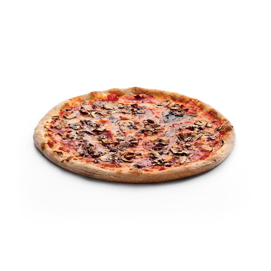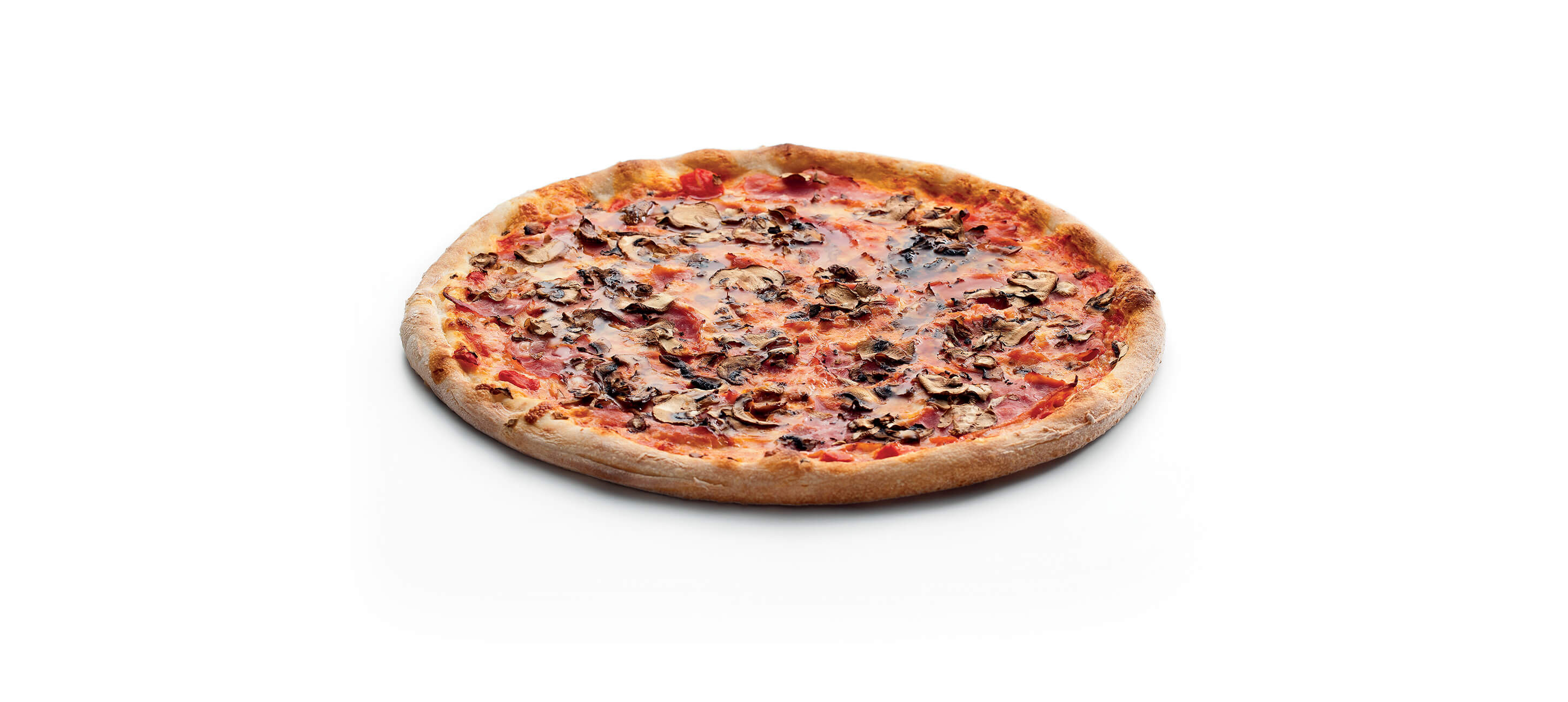 - 3Připravené roztažené těsto na 1 pizzu potřeme připravenou rajčatovou směsí, poklademe na plátky pokrájenou mozzarellou, rozložíme na ni plátky šunky a žampionů a pokapeme druhou lžičkou oleje. Dáme péct na rozpálený plech nebo kámen do trouby rozehřáté na maximum na 4–5 minut.