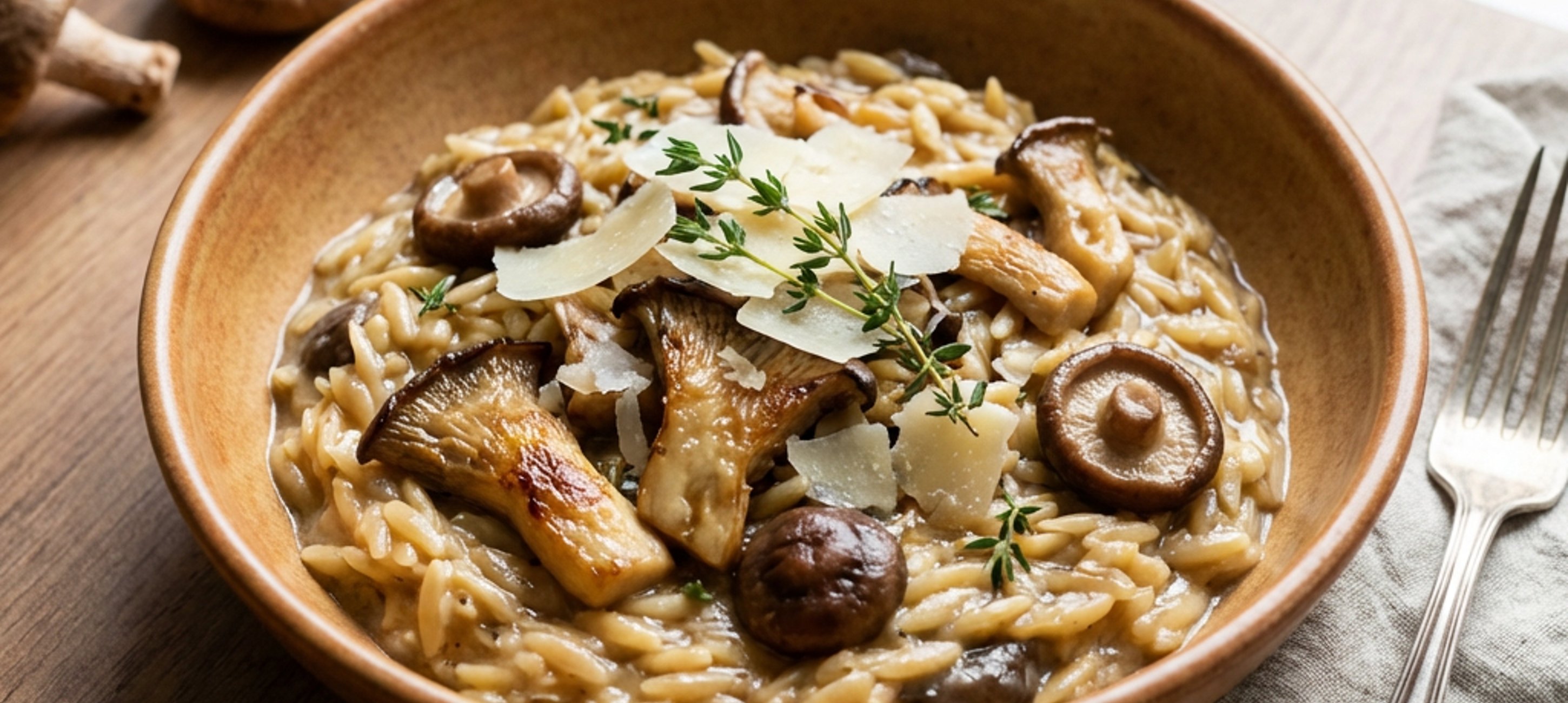 - 3Přisypeme orzo a smícháme s houbami. Přidáme nasekaný tymián. Přilijeme vývar a na mírném plameni necháme probublávat cca deset minut, dokud nebude orzo měkké. Pokud bude potřeba, přidáme trochu vývaru, nebo vody.
