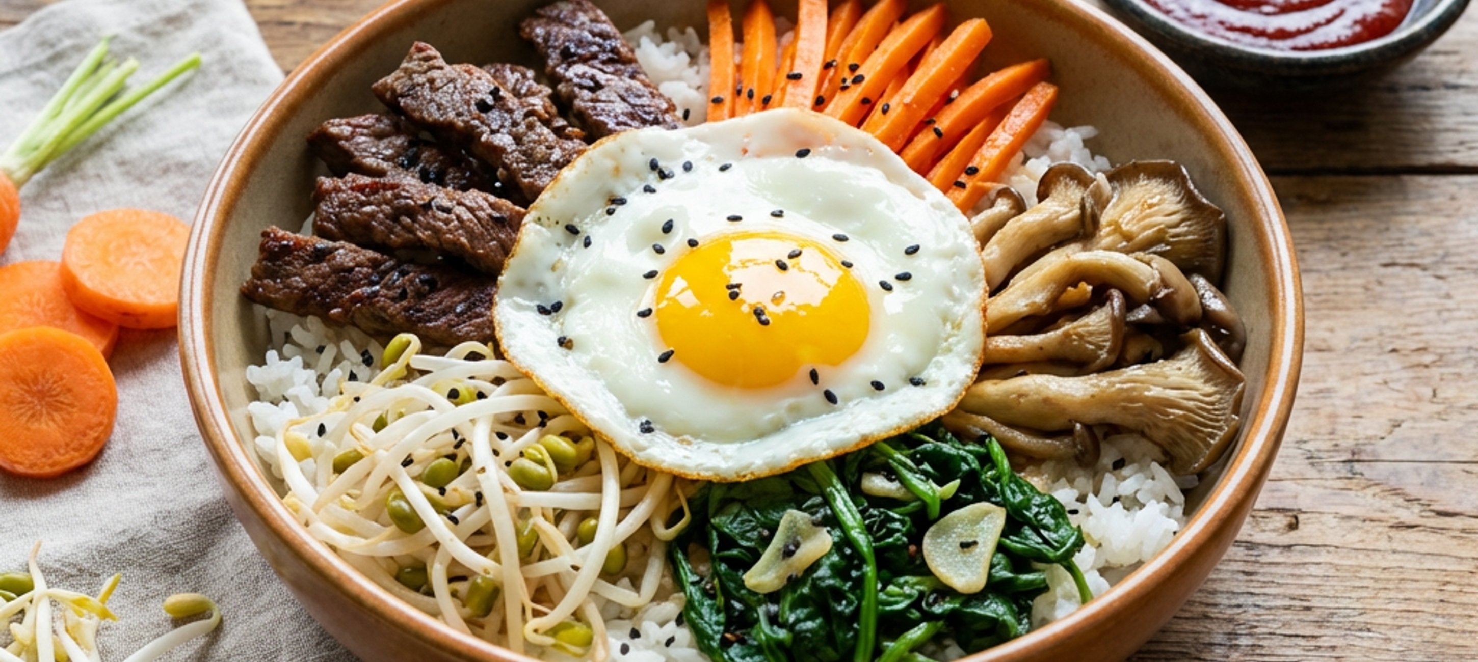 - 5Nyní celý pokrm zkompletujeme. Na dno misky vložíme rýži, doprostřed na rýži položíme volské oko a po okraji misky položíme mrkev, cibuli, houby, klíčky, špenát a maso. Podáváme s gochujang omáčkou.