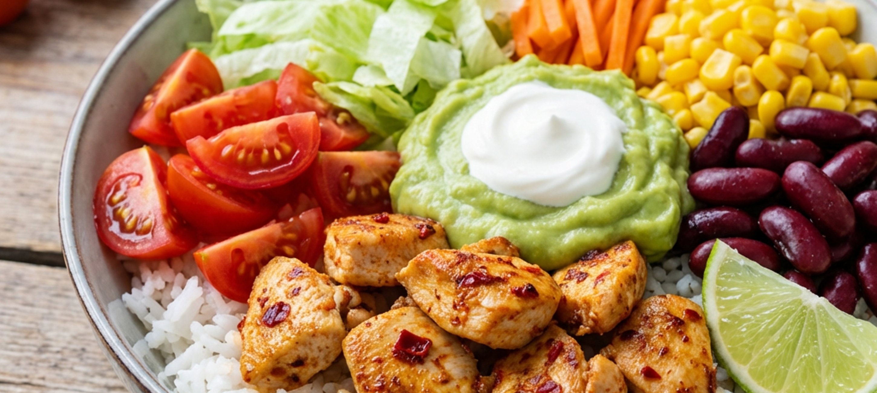 - 5Nyní celý pokrm zkompletujeme. Na dno misky vložíme rýži a poklademe kuřecím masem, zeleninou a avokádem. Podáváme se zakysanou smetanou.