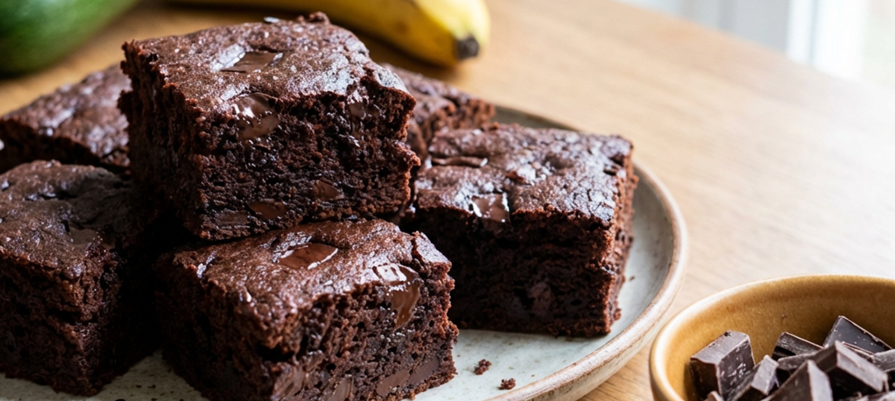 - 3Mezitím ve větší míse smíchejte kakao, špaldovou mouku a prášek do pečiva. Banány oloupejte, rozmačkejte vidličkou a přidejte do mísy spolu s 200 ml podmáslí, 1 vejcem a 2 lžícemi řepkového oleje. Vymíchejte v hladké těsto a přidejte nahrubo nasekanou čokoládu a nahrubo nastrouhanou cuketu zbavenou veškeré tekutiny. Zamíchejte a těsto nalijte na připravený plech.