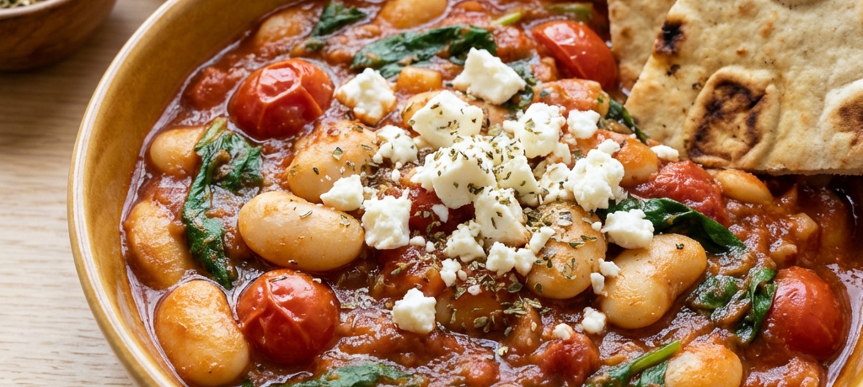 - 4Nakonec hrnec odstavte z plamene, do směsi přidejte rozdrobený feta sýr a promíchejte. Hotovou fazolovou směs rozdělte na jednotlivé porce a podávejte s pitou nebo kváskovým chlebem.