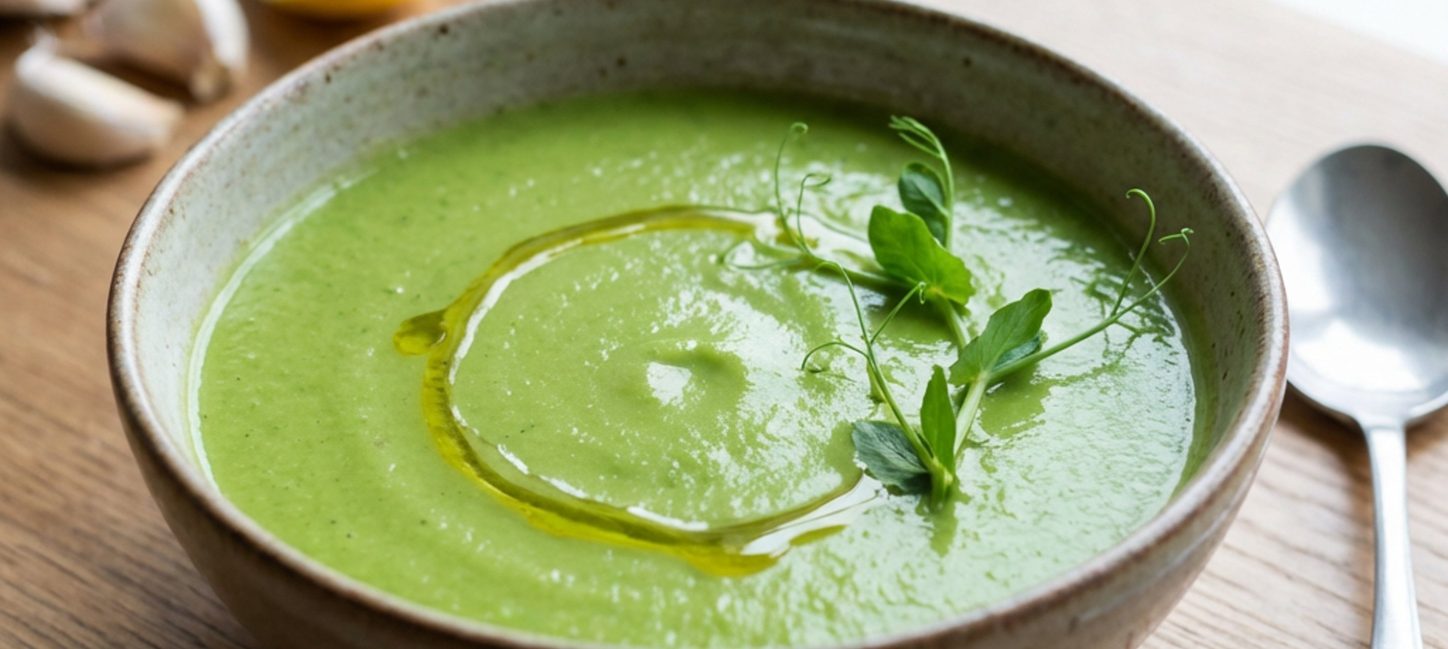 - 1Nejprve si najemno nakrájejte cibuli a česnek. Poté ve středně velkém hrnci rozpalte olej a na mírném až středním plameni restujte cibuli, dokud nezesklovatí (cca 4 minuty). Následně přidejte česnek a restujte další 1 minutu. Poté do hrnce vsypte hrášek, vše zalijte vývarem, přiveďte k varu a vařte 15 minut na mírném až středním plameni.