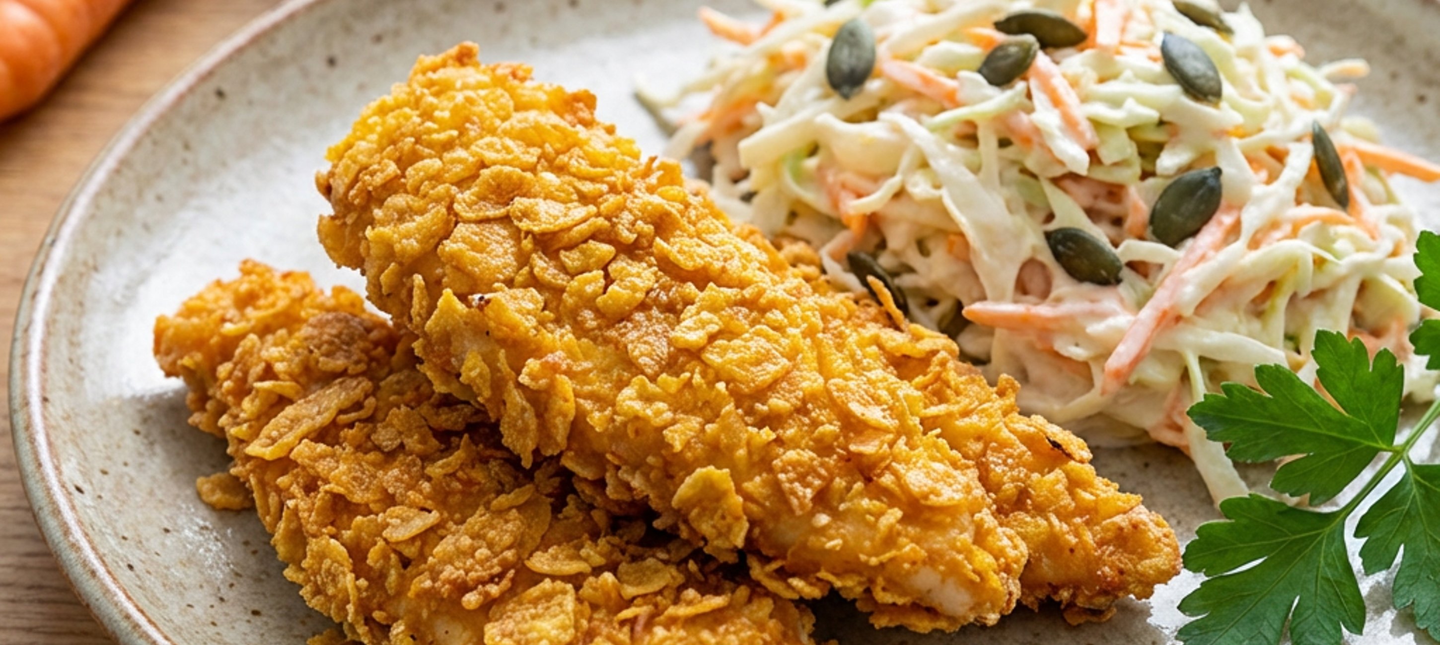 - 4Cornflakes rozdrťte najemno. Kuře vyndejte z lednice a jednotlivé „stripsy“ v cornflakes obalte a vyskládejte je na plech.