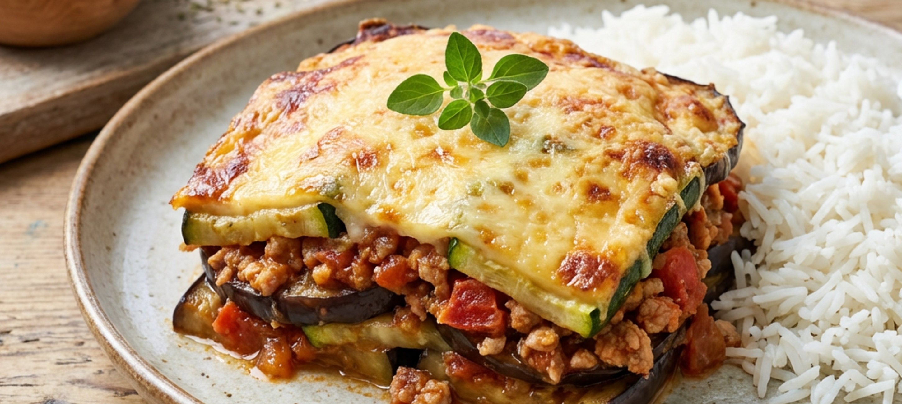 - 7Hotovou musaku vytáhněte z trouby, nechte 20 minut vychladnout a podávejte s rýží.
