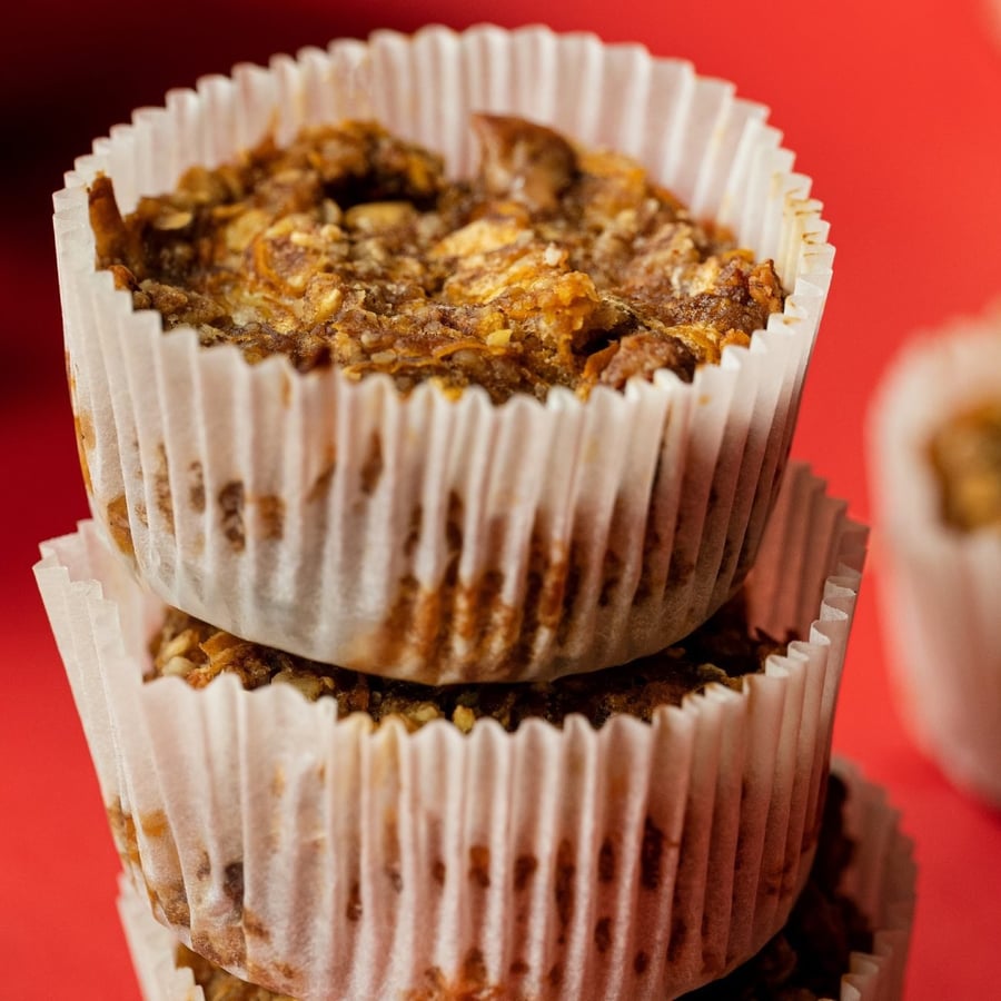 - 2Core the apple and grate it coarsely, grate the carrot finely, and place both in a medium-sized bowl. Mash the banana with a fork and add it to the bowl as well. Then add the remaining ingredients and mix everything together. Fill the prepared tin with the resulting batter and bake the muffins for 35–40 minutes at 170–180 °C. After removing, let them cool for at least 30 minutes.