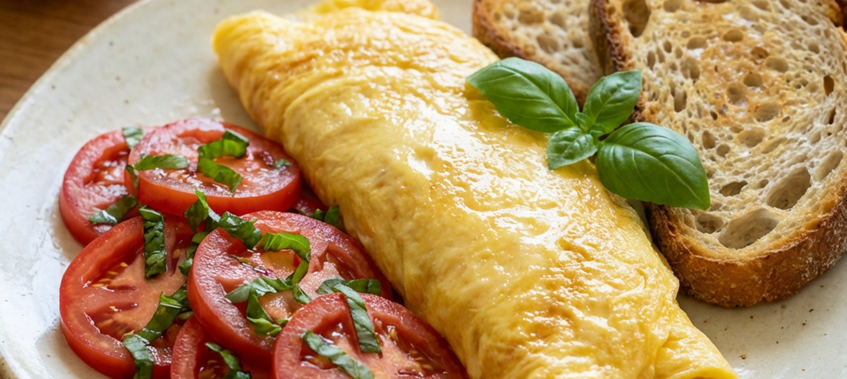 - 2Ve středně velké misce rozšlehejte vejce, osolte a opepřete. V pánvi (o průměru cca 18 cm) rozehřejte olej, poté na ni nalijte vejce a na mírném až středním plameni míchejte, dokud nebude omeleta z větší části uvařená. Plamen následně snižte na mírný stupeň, vejce nechte na pánvi a počkejte, dokud povrch nebude krásně lesklý, ale už ne mokrý. Vzniklou omeletu zarolujte a vyklopte na talíř.