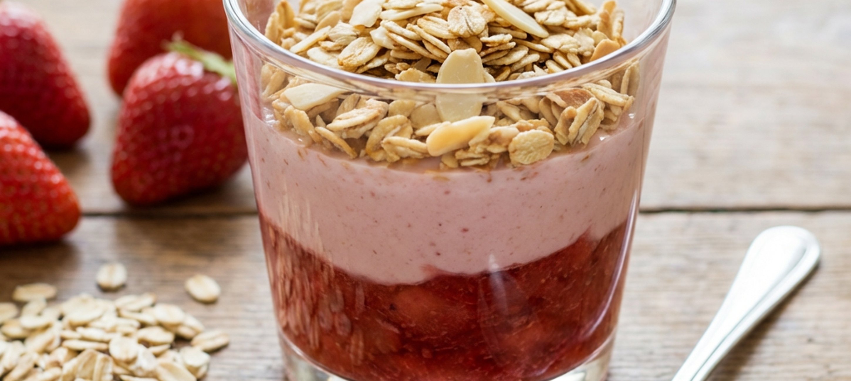 - 3Následně ½ rozvařených jahod smíchejte s tvarohem a můžete začít vrstvit. Připravte si 3 stejně velké skleničky (o objemu cca 200 ml) a vrstvěte v tomto pořadí: jahody, tvaroh, vločky s mandlemi. Opakujte ještě jednou. Nakonec nakrájejte čerstvé jahody na tenčí plátky a parfait jimi ozdobte. Dejte do lednice alespoň na 15 minut a podávejte.