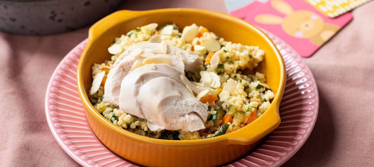 - 4Zchladlé kuře dejte stranou na talíř a oberte jej. Zeleninu z pekáče přidejte spolu s pažitkou a platky mandlí do mísy s uvařeným bulgurem a promíchejte.