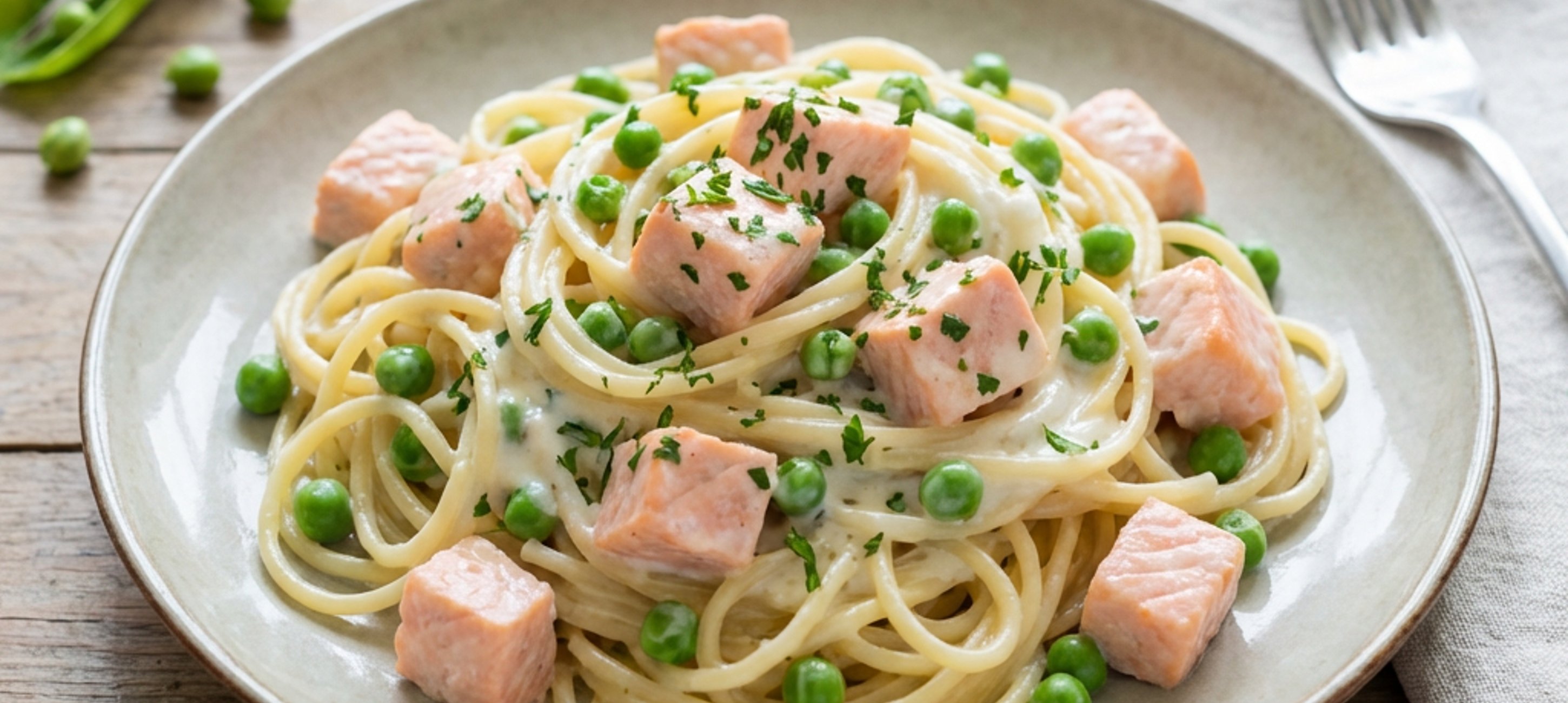 - 4Po orestování přilijte vodu a smetanu, přidejte smetanový sýr a vše vařte, dokud smetana nezhoustne, což potrvá 4–5 minut. Nakonec do pánve vložte hrášek, petrželovou nať a těstoviny, promíchejte, vypněte plamen a podávejte.