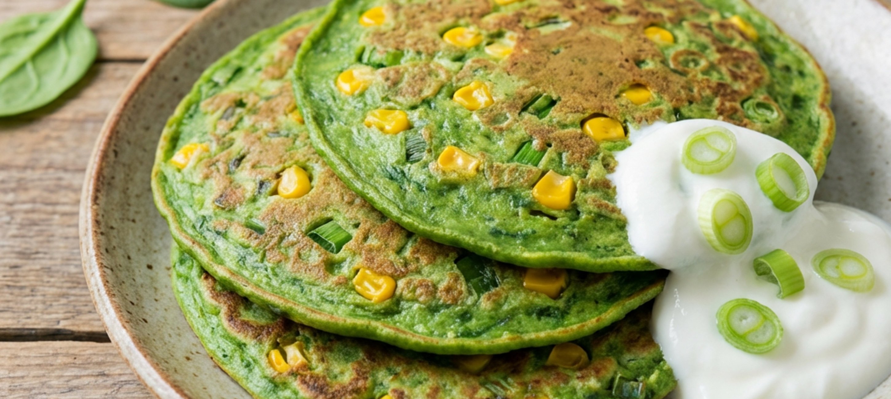 - 1Do vyšší mixovací nádoby vložte mouku, mléko, vejce, baby špenát, česnek, řepkový olej, prášek do pečiva a sůl a vše pomocí tyčového mixéru rozmixujte na hladké těsto. Do hotového těsta přimíchejte scezenou kukuřici a najemno nakrájenou jarní cibulku.