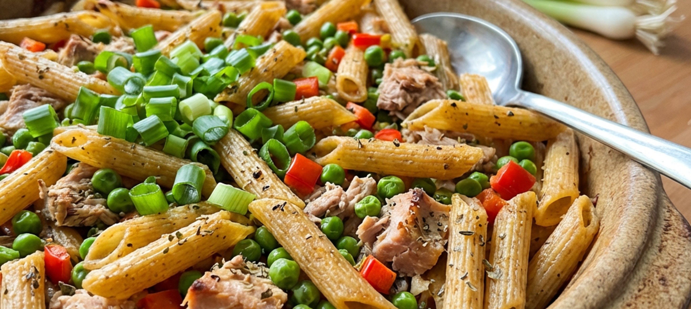 - 4Uvařené těstoviny vsypte k tuňákové směsi a promíchejte. Pánev následně vložte do vyhřáté trouby a zapékejte 20–25 minut na 200–205 °C. Poté pánev vyjměte, pokrm rozdělte na jednotlivé porce a podávejte.