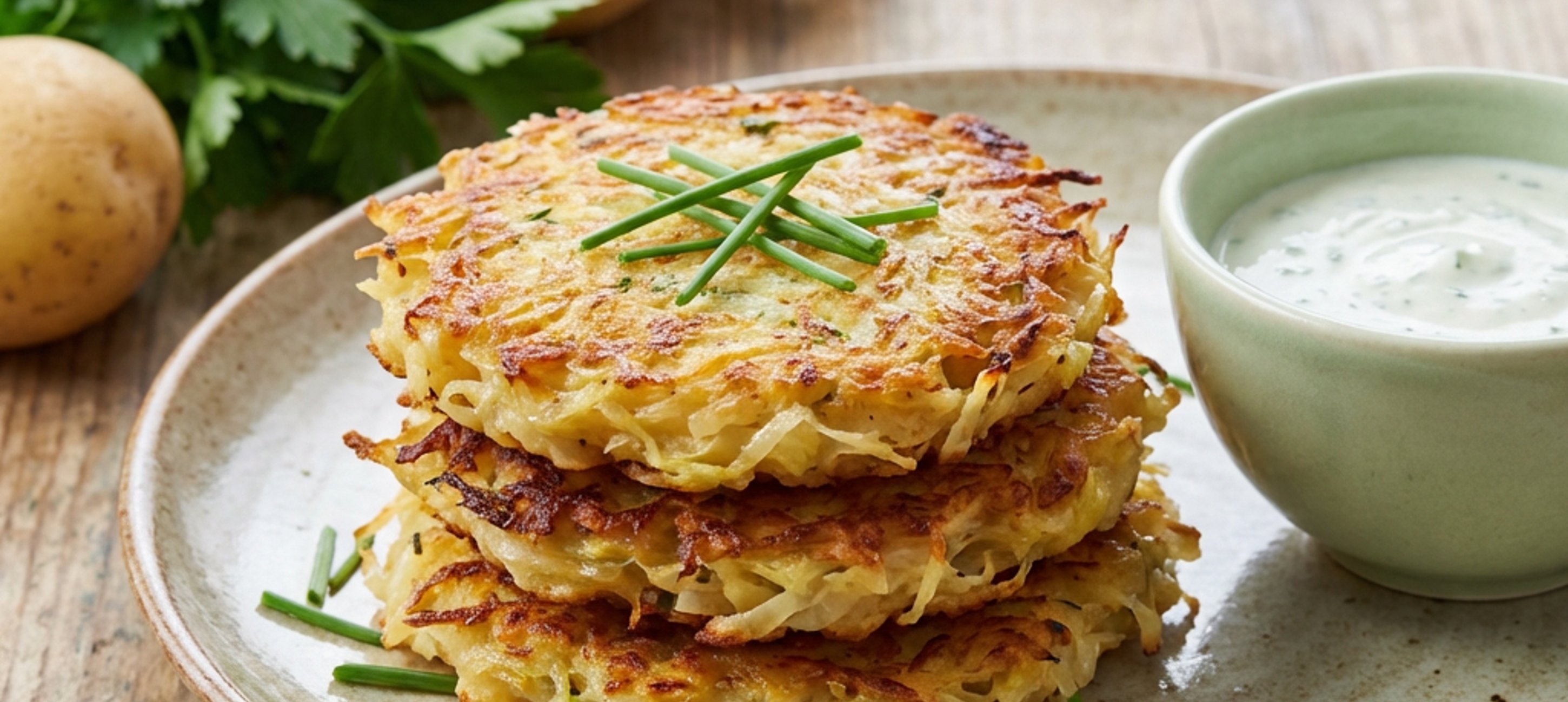 - 5Hotové bramboráčky rozdělte do jednotlivých talířů a podávejte s připraveným bylinkovým dipem.