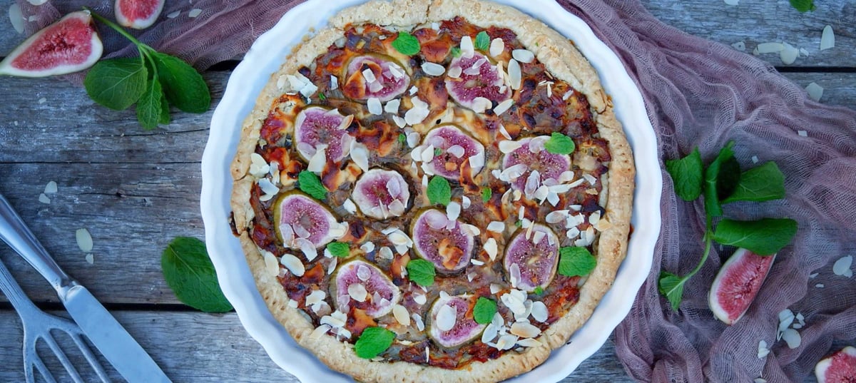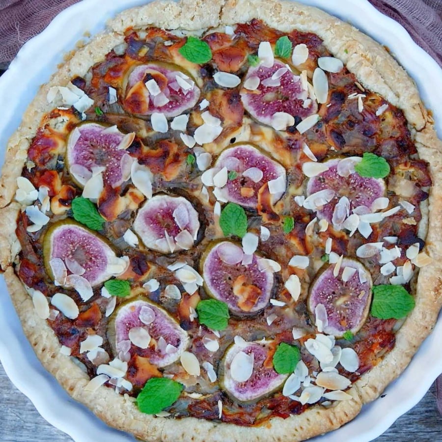 - 3Roll out the dough into a thin sheet. Line a round 25 cm diameter form with the dough. Prick with a fork and bake for 20 minutes in a preheated oven at 180 degrees Celsius. Then fill with the prepared mixture, top with sliced figs, sprinkle with the remaining almonds and pieces of goat cheese. Bake for 35 - 40 minutes at 180 degrees Celsius.