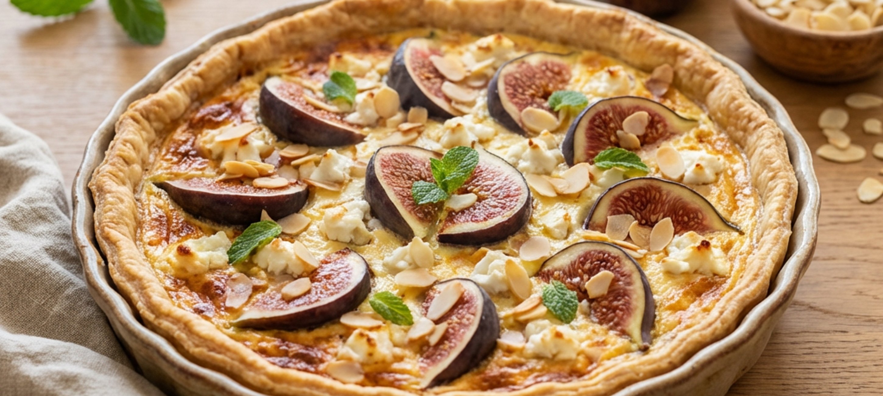 - 3Těsto vyválíme na tenkou placku. Těstem vyložíme kulatou formu o průměru 25 cm. Vidličkou propícháme a dáme péct na 20 minut do předehřáté trouby na 180 stupňů. Poté naplníme připravenou směsí, nahoru poklademe na plátky nakrájené fíky, posypeme zbytkem mandlí a kousky kozího sýru. Dáme péct na 35 - 40 minut na 180 stupňů.