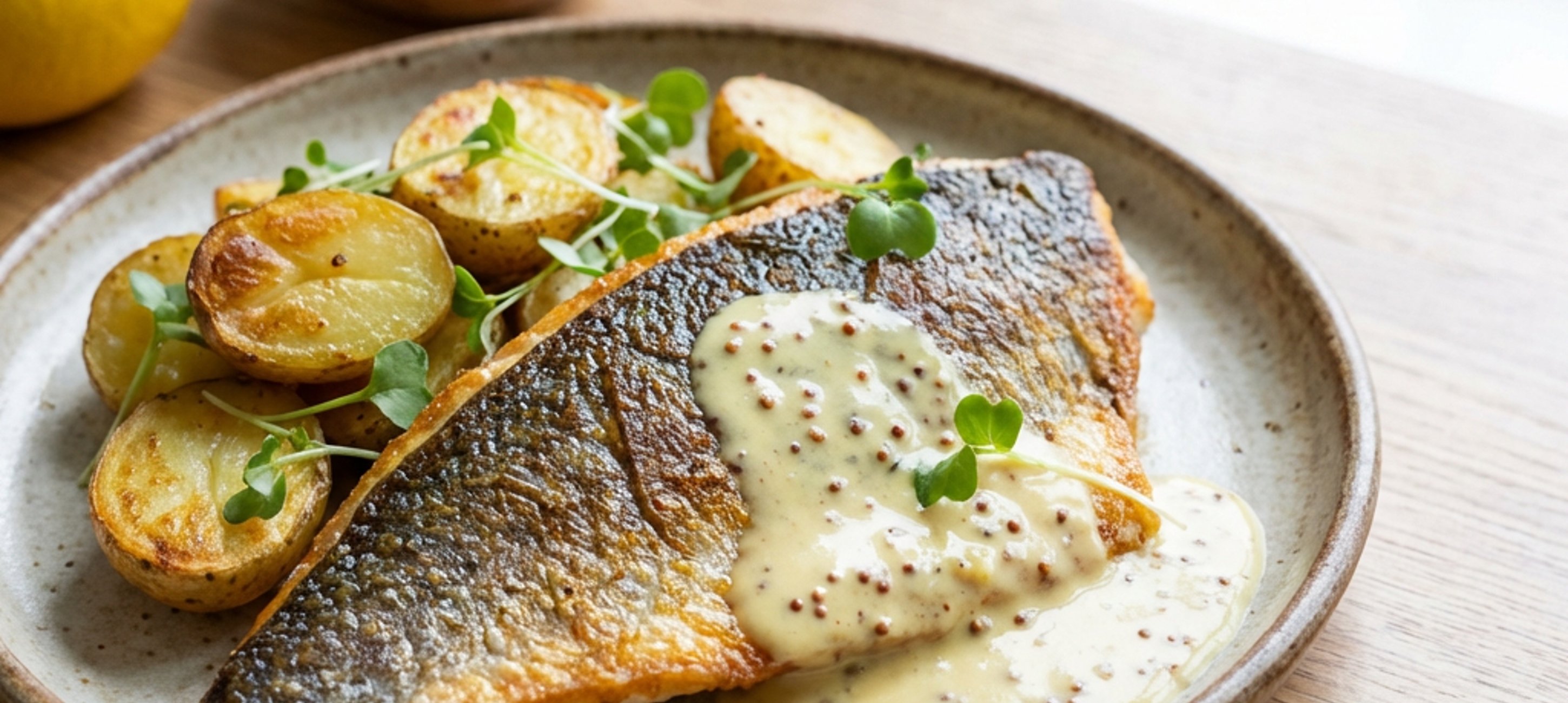 - 4Podáváme s hořčicovou omáčkou, mikrogreens a v troubě pečenými baby bramborami.