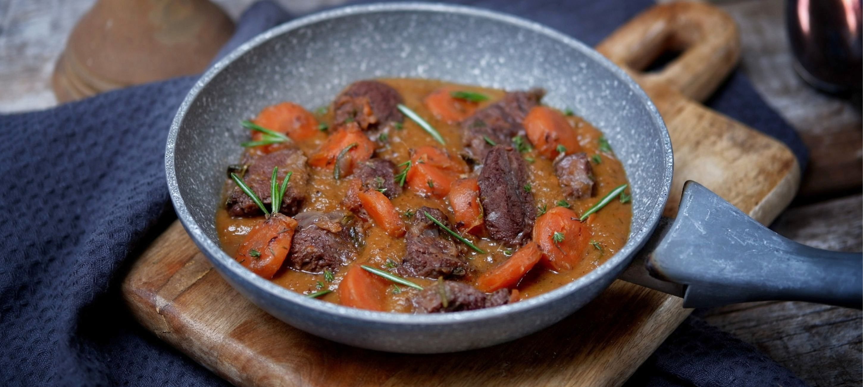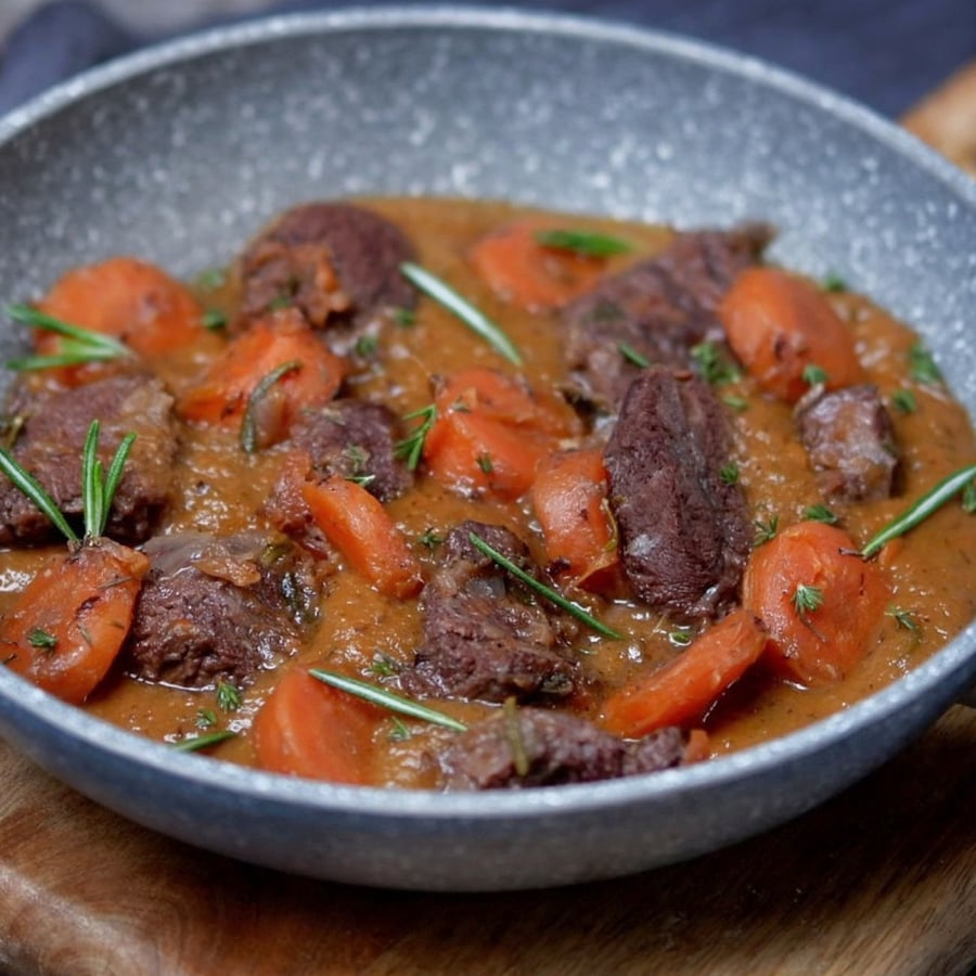 - 1Wash the carrots and cut them into slices. Cut the onion into half-moons. Peel and halve the garlic. Sauté the onion in hot oil until golden brown, then add the carrots and garlic. Sauté together for about 5 minutes. Then set everything aside. Cut the meat into larger cubes. Increase the heat and sear the meat quickly. Once the meat is seared, return the vegetables, pour in the wine, and bring to a boil. Then add whole sprigs of herbs, spices, and pour in 0.75 l of water. Salt and let simmer gently on a very low flame for 2.5 - 3 hours.