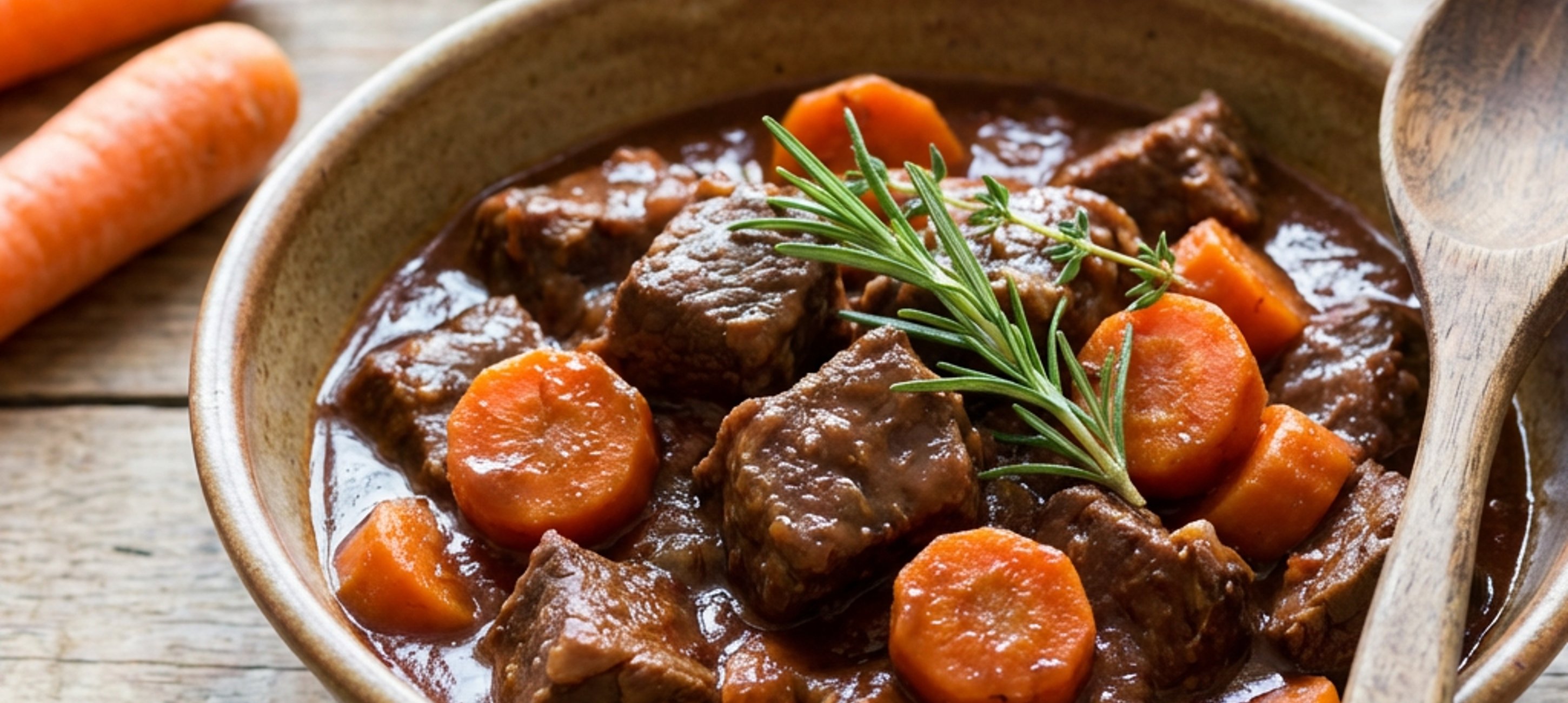 - 1Mrkev opereme a nakrájíme na kolečka. Cibuli nakrájíme na půlkolečka. Česnek oloupeme a přepůlíme. Na rozpáleném oleji dozlatova orestujeme cibuli, přidáme mrkev a česnek. Cca 5 minut společně restujeme. Poté dáme vše stranou. Maso nakrájíme na větší kostky. Zvýšíme plamen a zprudka necháme maso zatáhnout. Jakmile bude maso zatažené, vrátíme zpět zeleninu, přilijeme víno a přivedeme k varu. Poté přidáme celé snítky bylinek, koření a zalijeme 0,75 l vody. Osolíme a na velmi mírném plameni necháme pomale dusit 2,5 - 3 hodiny.