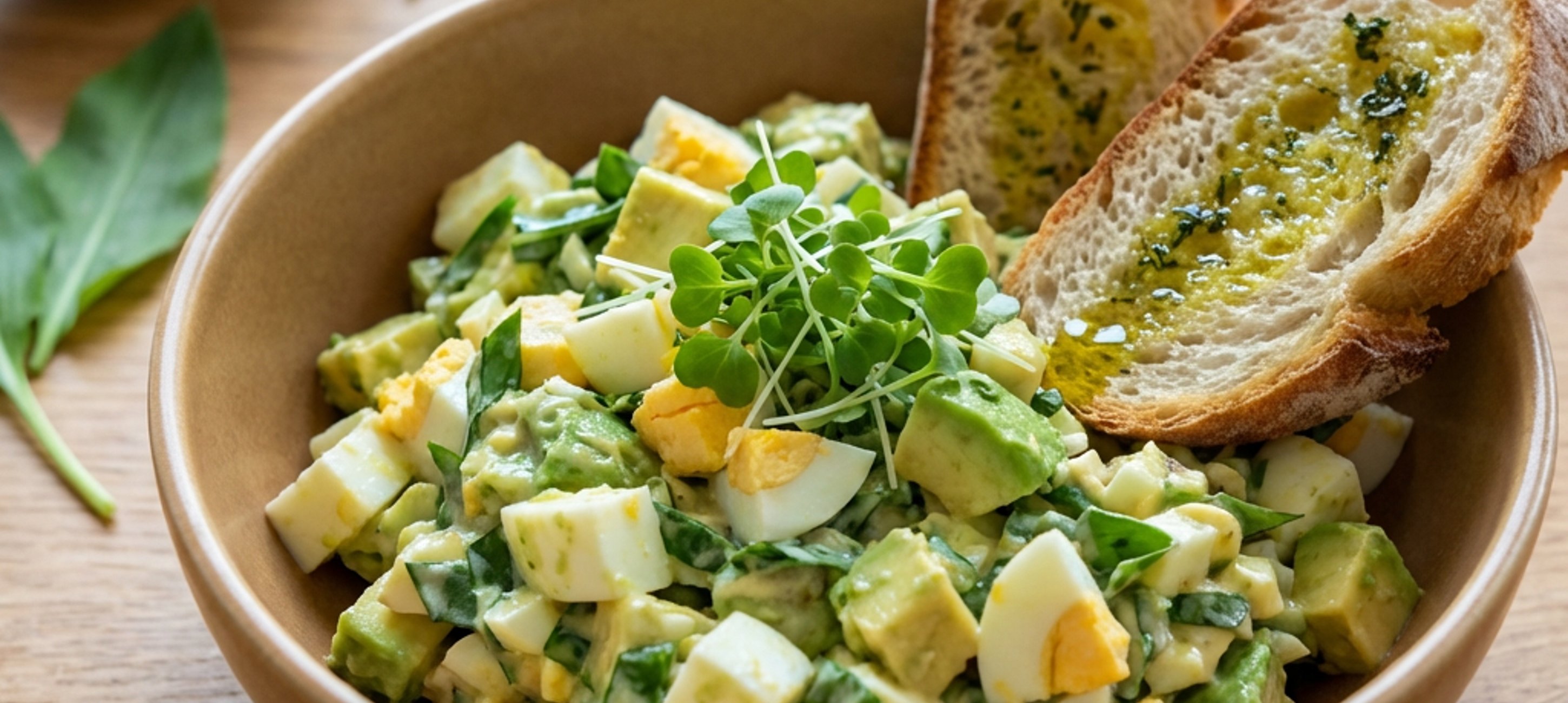 - 8Bagetu opečeme dokřupava, zakápneme ochuceným olivovým olejem a podáváme s čerstvým vaječným salátkem a klíčky hrášku.