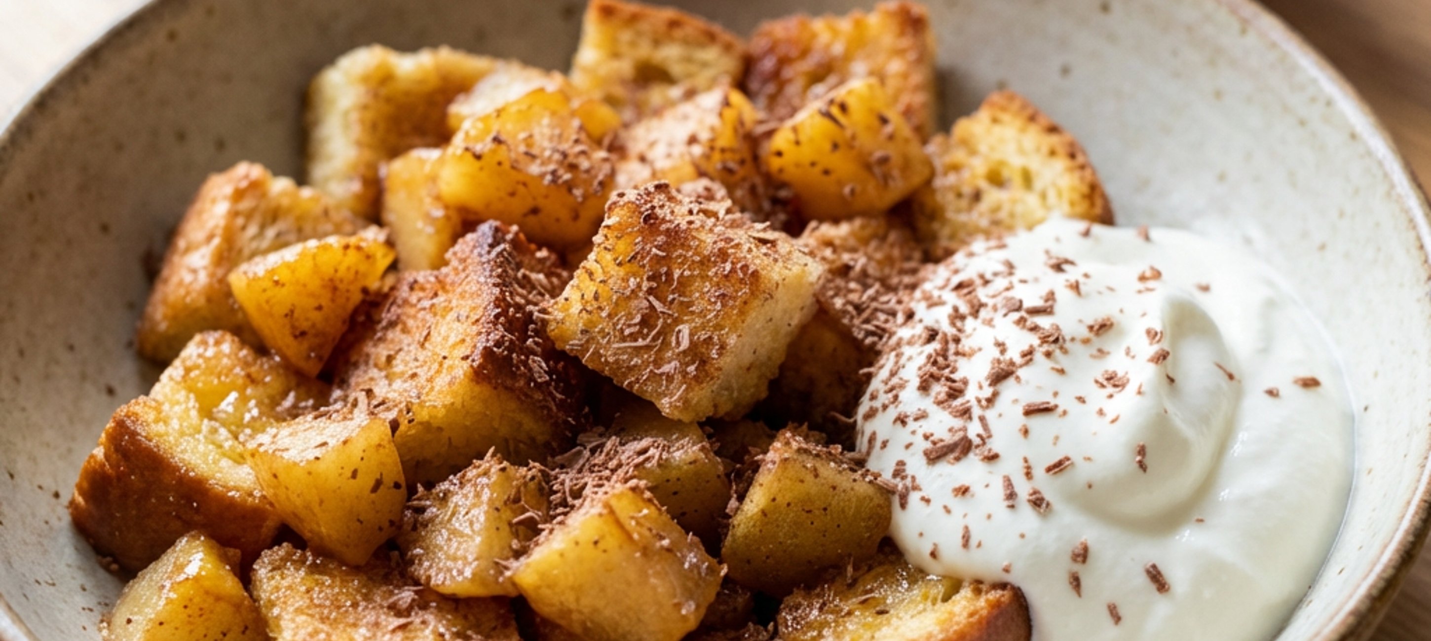 - 3Ukroj si 1 plátek z velikonočního věnce nebo mazance a nakrájejte na kostičky, ty poté přidejte k jablíčku a mírně osmažte.