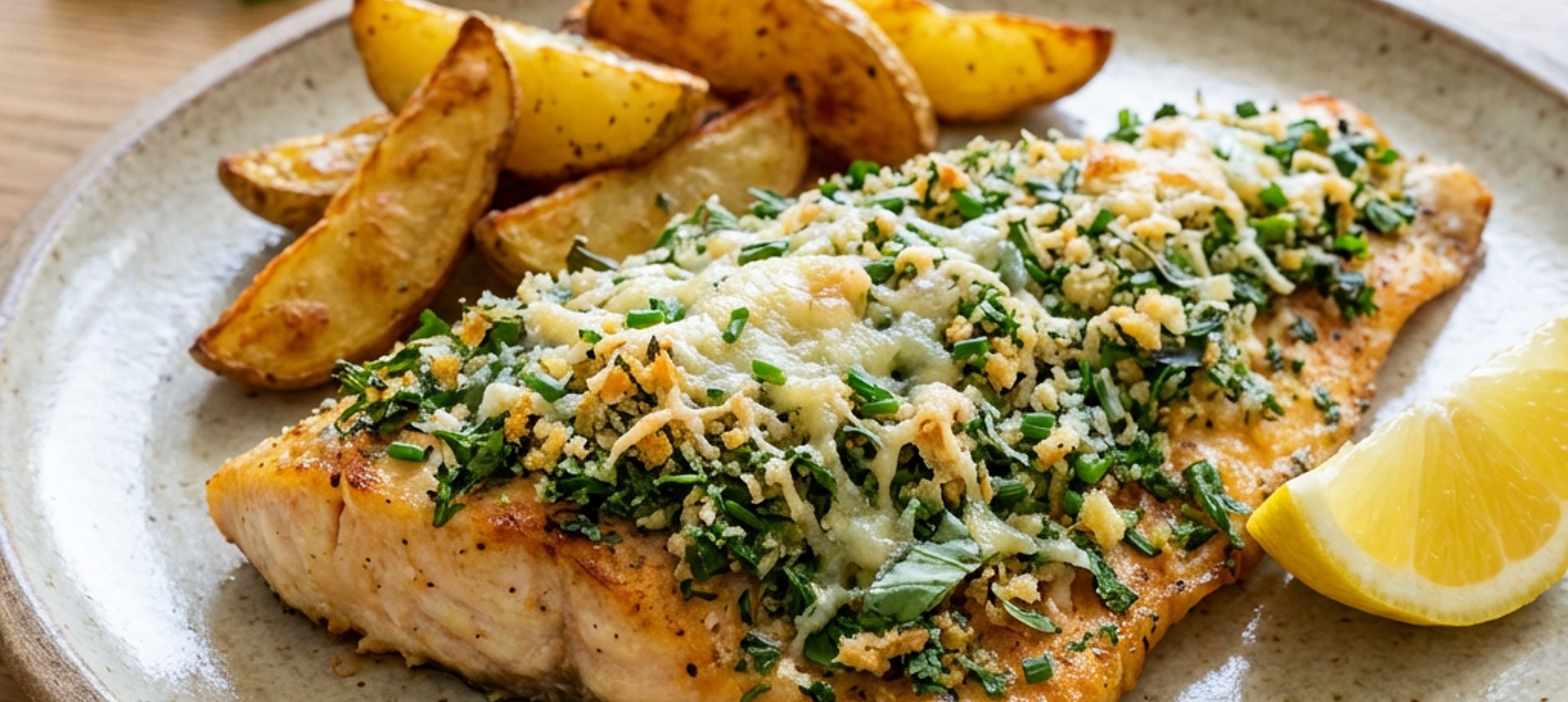 - 4Rybu osušíme papírovou utěrkou, poté osolíme a opepříme. Na pekáč položíme pečící papír, na něj filety, na které navrstvíme bylinkovou krustu a pořádně přimáčkneme.