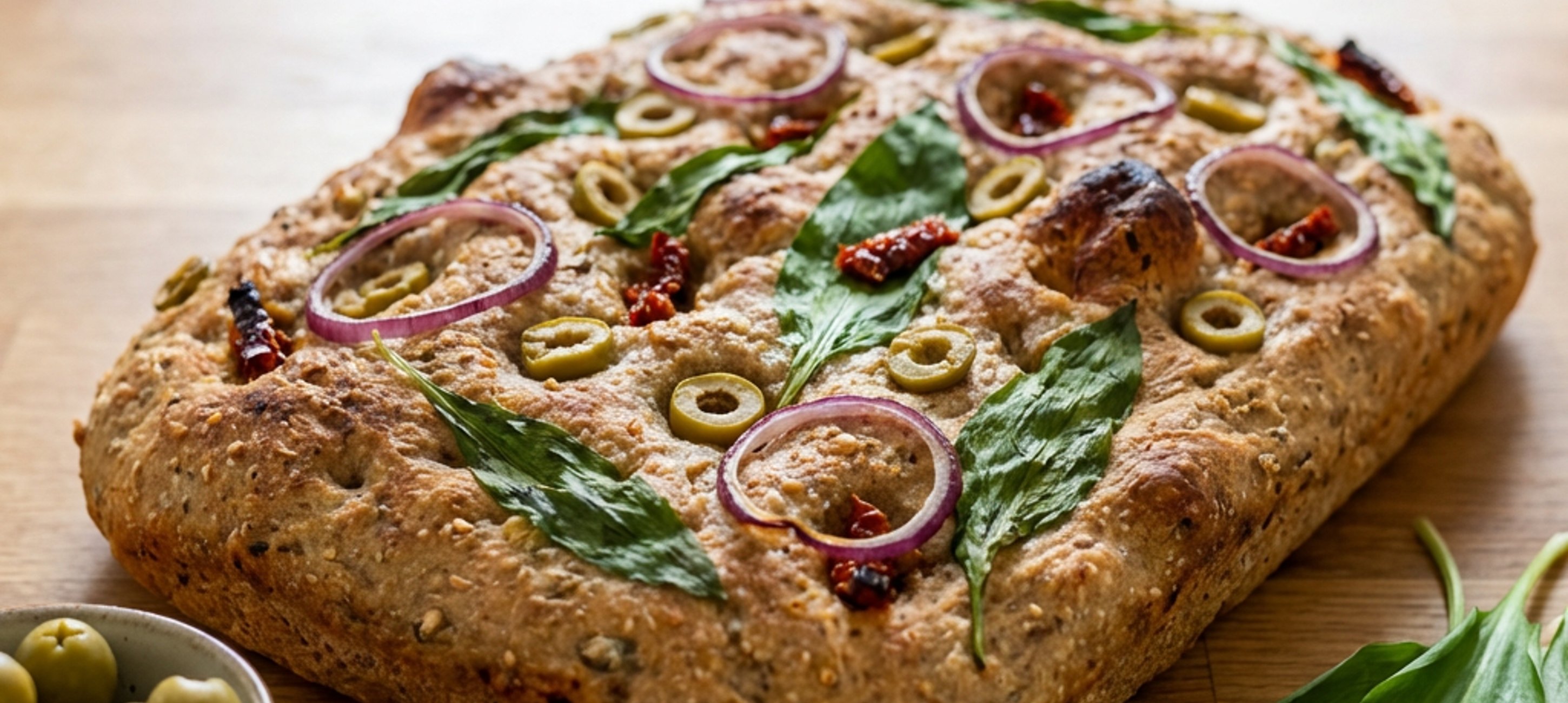 - 6Vykynuté těsto pokapeme olivovým olejem a roztaženými prsty uděláme do těsta důlky. Na povrch poklademe kroužky cibule, olivy a na kousky nakrájená sušená rajčata. Vložíme do trouby. Pečeme 12 minut, stáhneme teplotu na 220 °C a pečeme dalších 5 minut nebo do zezlátnutí povrchu.
