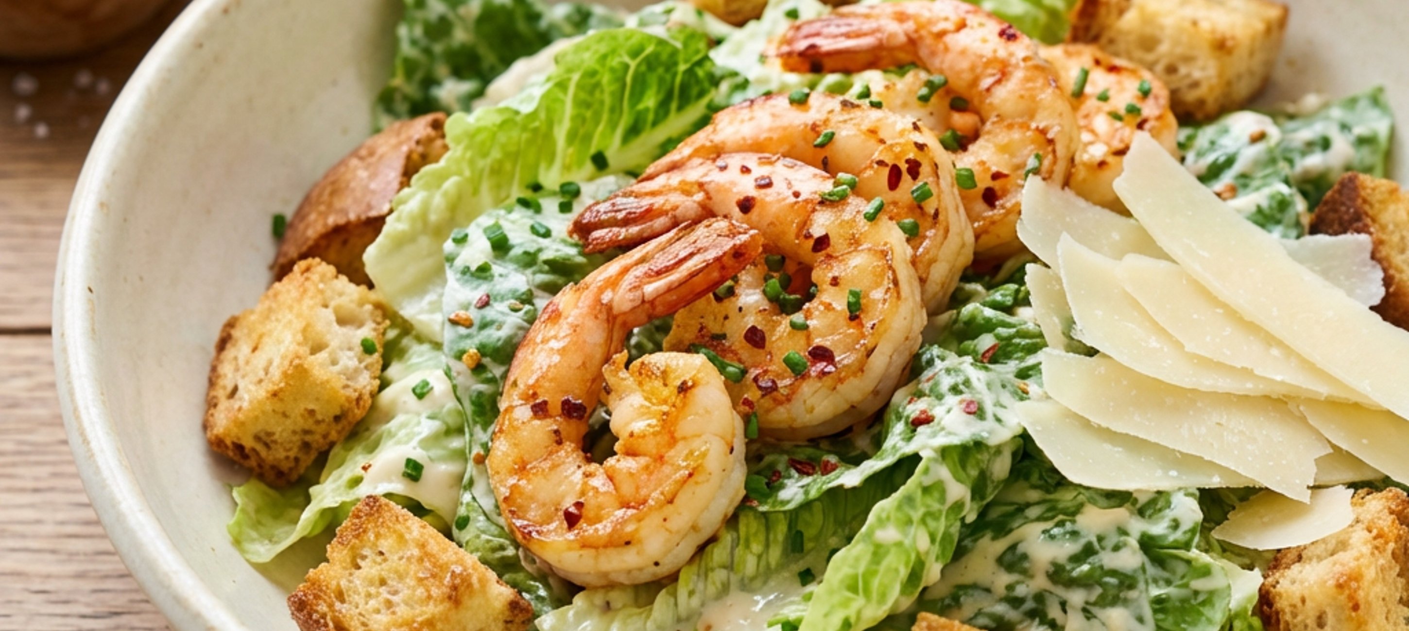 - 4Salát natrháme na menší kousky a smícháme se zálivkou. Podáváme s restovanými krevetami, křupavými krutonky a posypané parmezánem.
