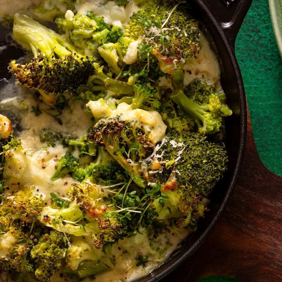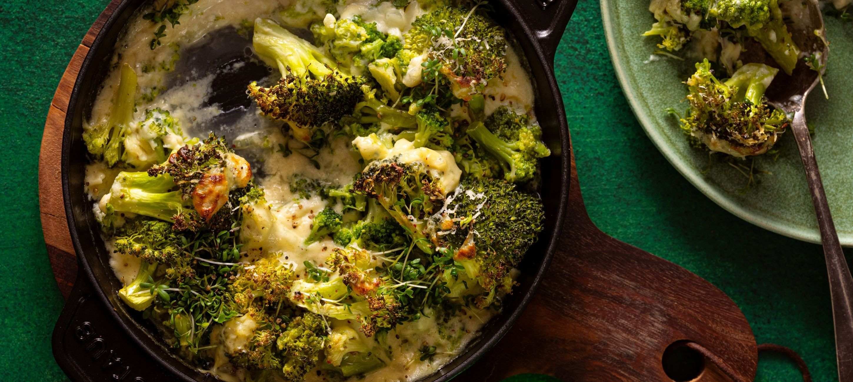 - 4Once the broccoli is cooked, drain the water and transfer the broccoli to the baking dish. Then spread the prepared cheese mixture over the broccoli, place the baking dish in the preheated oven, and bake for 12–13 minutes at 220–225 °C.