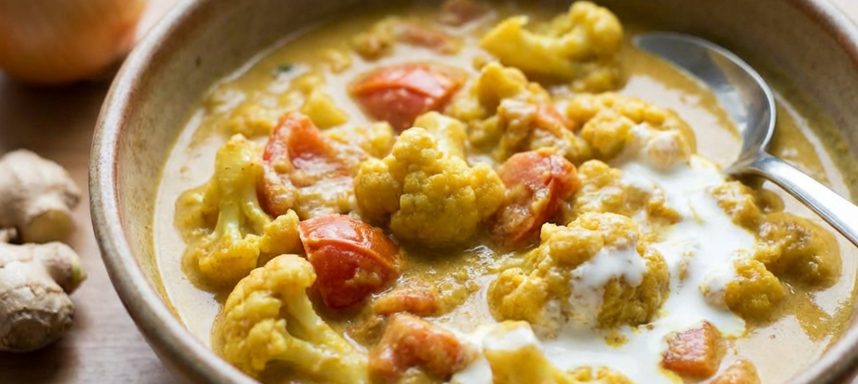 - 3Do hrnce přidejte nakrájený česnek, nakrájená rajčata, kari koření a nastrouhaný zázvor, plamen zvyšte na střední stupeň, vše opékejte 1–2 minuty a poté obsah hrnce zalijte 200 ml vody. Následně přidejte květák, plamen zvyšte na silný stupeň a vodu přiveďte k varu. Jakmile voda zavaří, snižte plamen na střední stupeň a vařte 15–20 minut, dokud květák nezměkne. Vařte bez pokličky, aby se voda zredukovala a kari bylo později po nalití smetany krásně husté.