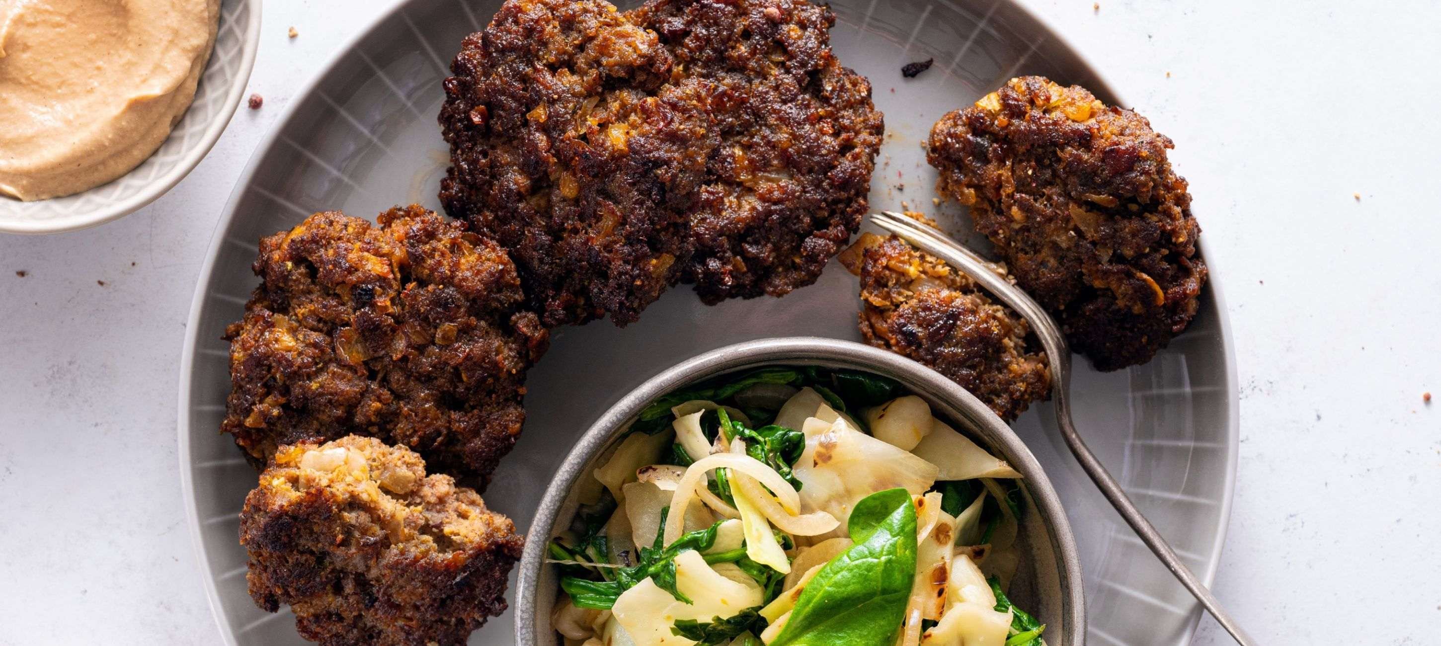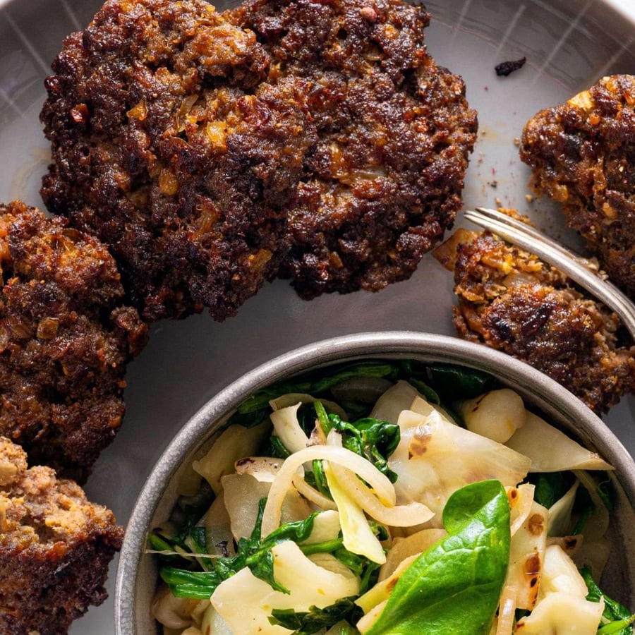 Clean the pan in which the onion was sautéed, and heat 1.5 tablespoons of canola oil over medium heat. Then place the patties in the pan, sauté them over medium heat for 2–3 minutes on each side, and then transfer them to the prepared baking sheet.