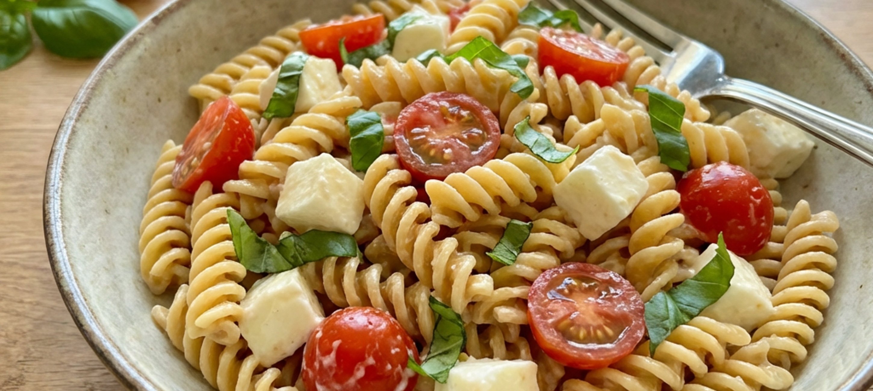 - 1Ve větším hrnci přiveďte k varu 2 l vody na vaření těstovin. V mezičase omyjte a na poloviny nakrájejte cherry rajčátka. Mozzarellu nakrájejte na kostičky a hrst bazalky nakrájejte nahrubo. Vše dejte do větší mísy.