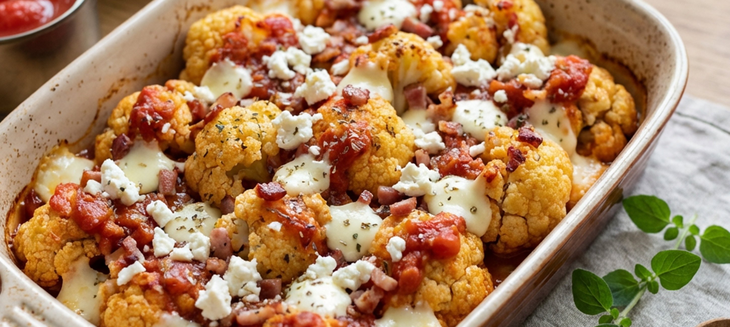 - 5Takto připravený květák vložte do zapékací nádoby k vyškvařené slanině, promíchejte a pečte 16–17 minut při 220–225 °C.
