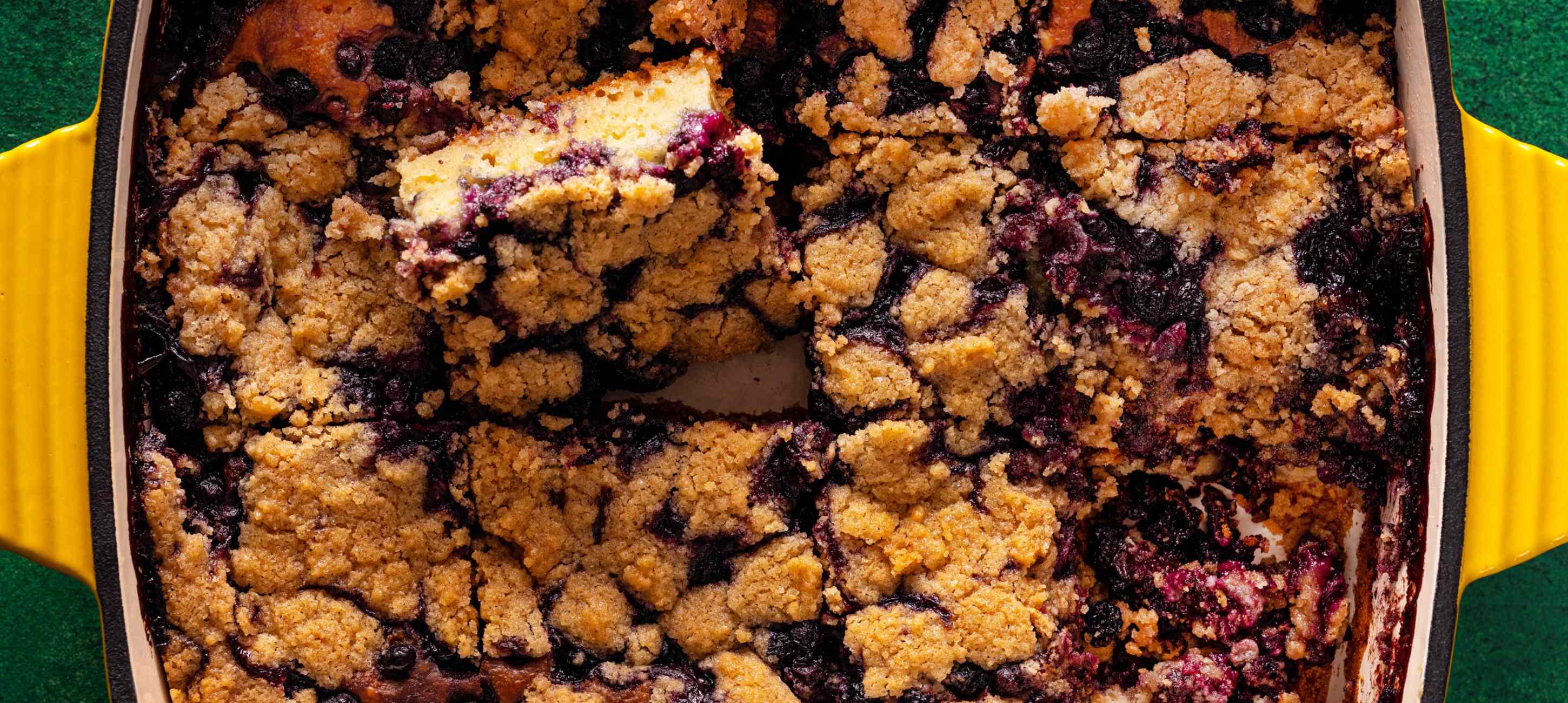 - 4Na těsto rozprostřete borůvky a nasypte připravenou drobenku.