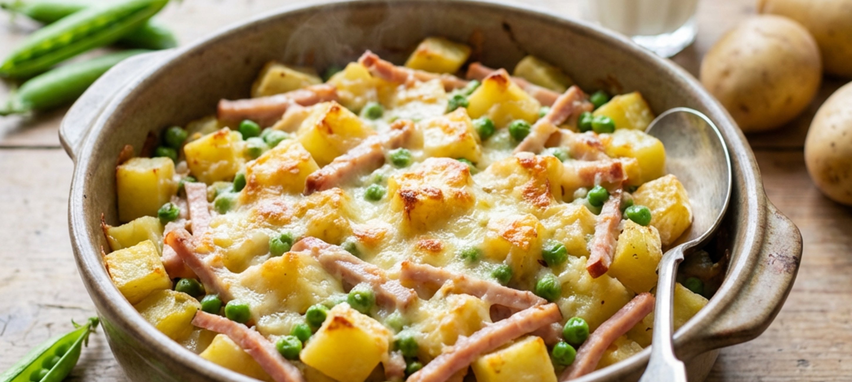 - 5Do mísy s bramborami, šunkou a eidamem přidejte ještě mražený hrášek, vejce, mléko, sůl a pepř a vše promíchejte. Výslednou směs přemístěte do zapékací nádoby, tu dejte do vyhřáté trouby a pečte 35 – 40 minut na 200 – 205 °C. Zapečené brambory rozdělte na 4 porce a podávejte.