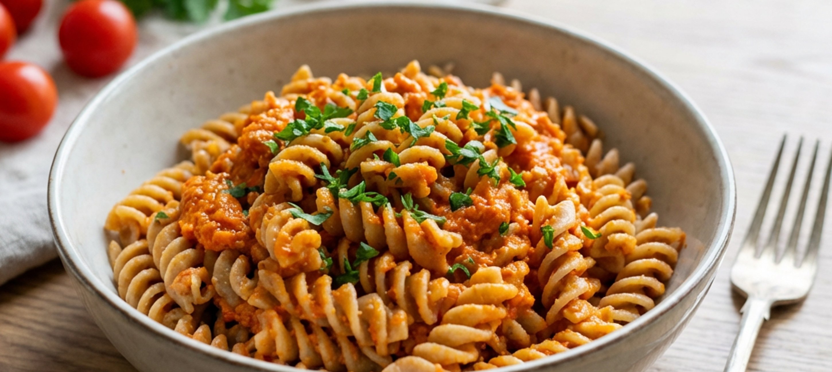- 5Vzniklé pesto promíchejte s uvařenými těstovinami, výslednou směs rozdělte na 4 porce a podávejte.