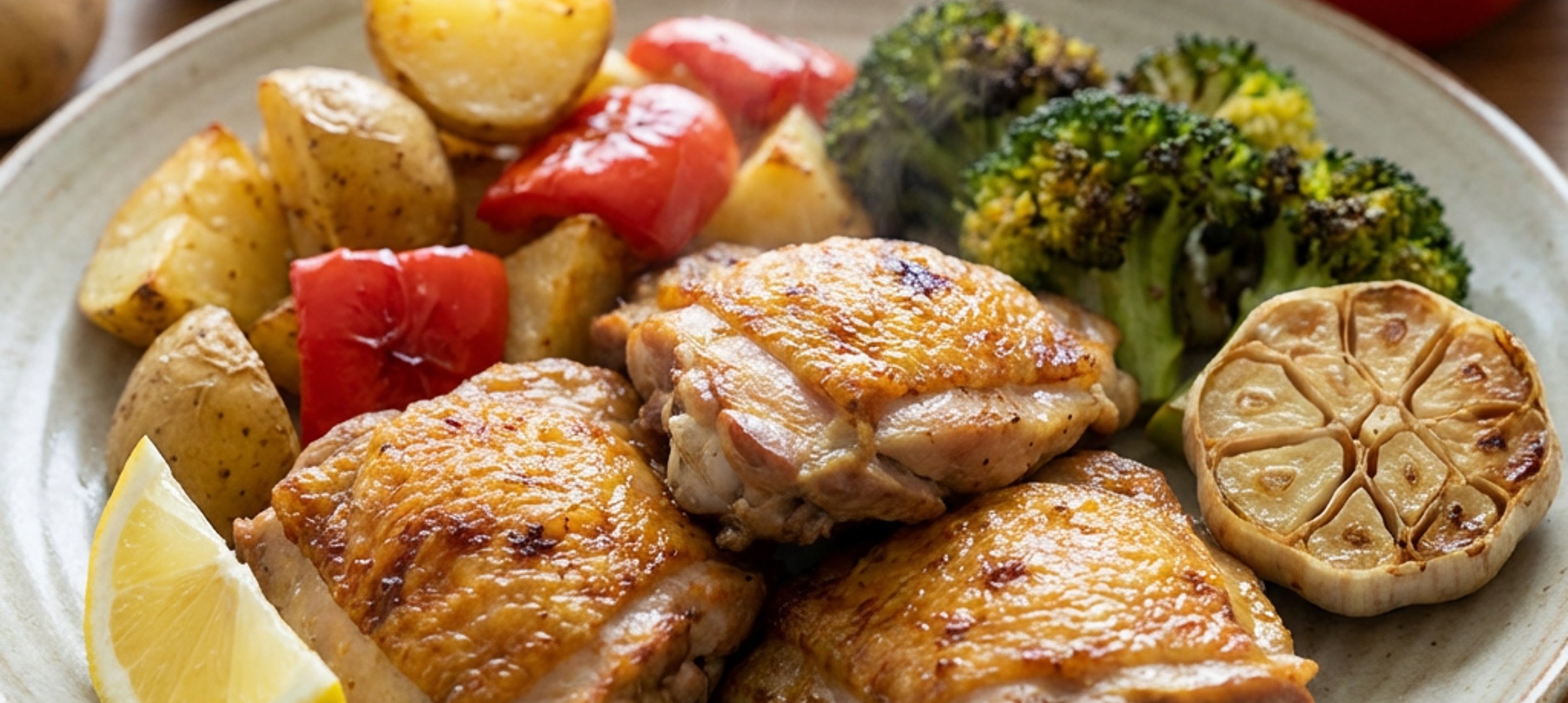 - 4Po 15 minutách pečení brambor vyndejte plech z trouby a k bramborám přidejte všechnu nakrájenou zeleninu (obě poloviny palice česneku na plech položte rozříznutou stranou dolů). Následně celou směs osolte a zakápněte 1 lžící řepkového oleje a na vrch rozložte obalené kousky kuřecích stehna. Plech vložte znovu do trouby a vše pečte 30 – 40 minut při 190 – 200 °C.