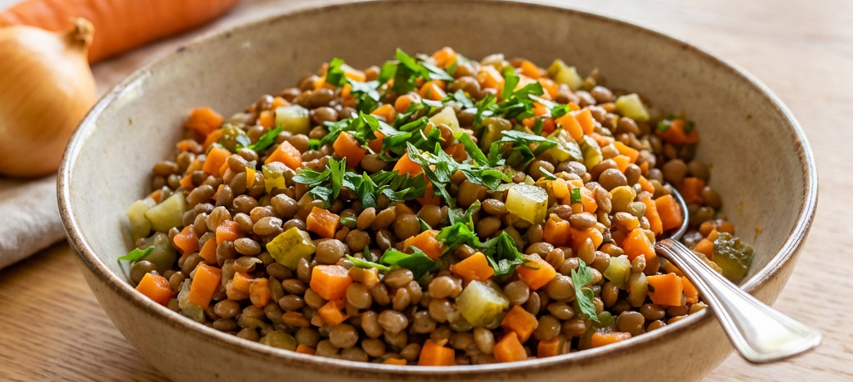 - 3Poté si vezměte středně velkou mísu a vložte do ní nakrájenou mrkev, cibuli a okurky. Jakmile se čočka uvaří, propláchněte ji pod studenou vodou a přidejte do mísy k nakrájeným ingrediencím.