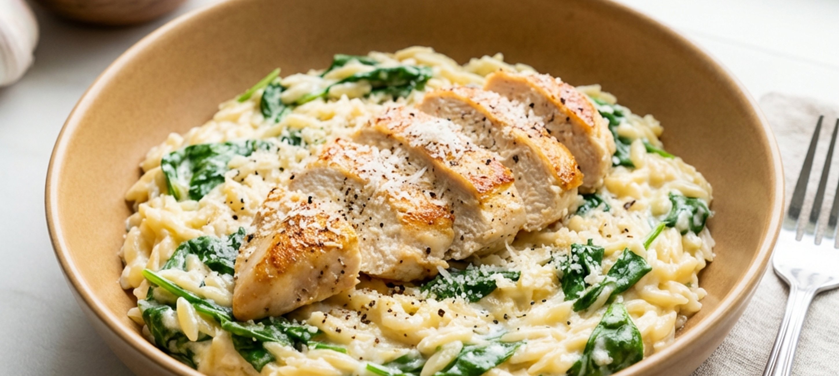 - 2Orzo uvaříme dle návodu. Vodu z orza, po uvaření slijeme a odměříme 200 ml. Uvařené orzo přidáme do pánve se špenátem, přidáme ricottu, nastrouhaný parmezán a vodu z těstovin. Zahřejeme a dobře promícháme v hladkou konzistenci. Dochutíme solí a mletým pepřem. Pokud je orzo husté, přídáme ještě více vody a konzistenci doladíme.