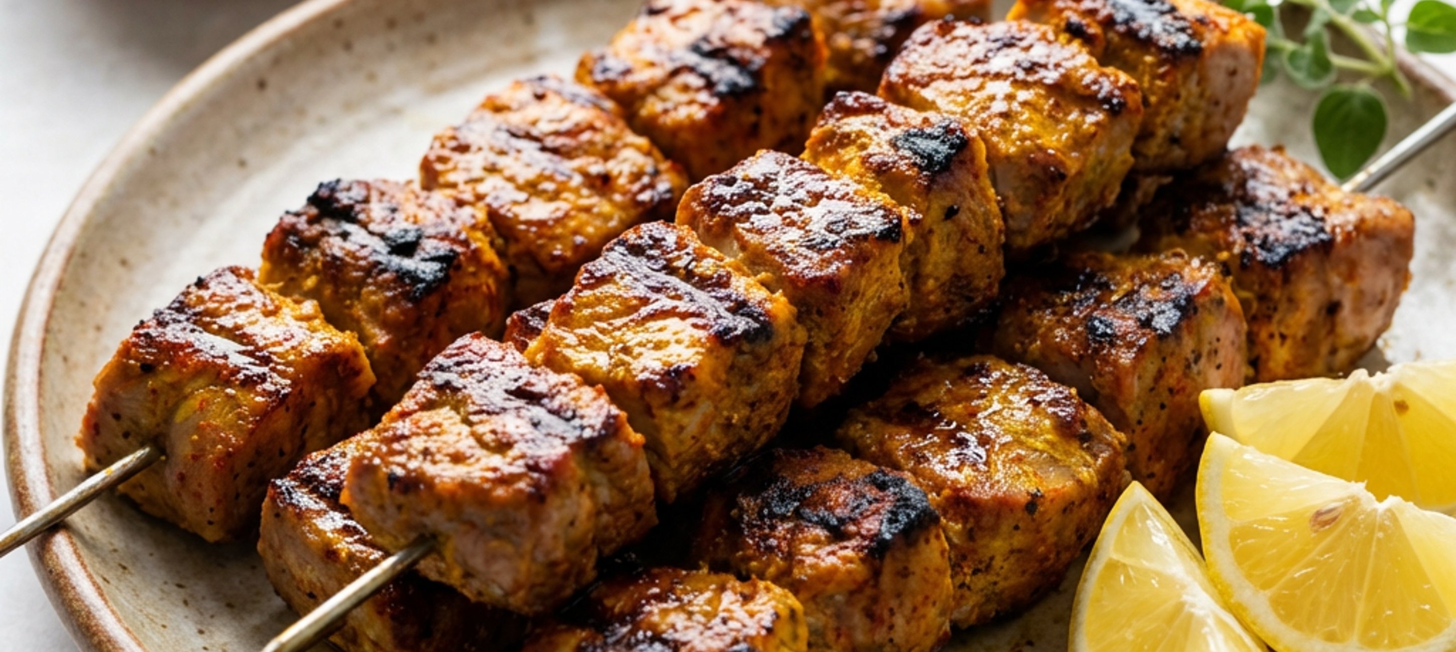 - 2Ve misce smíchejte všechna koření, olivový olej a citronovou šťávu a poté výslednou směs přelijte na vepřové kostky.