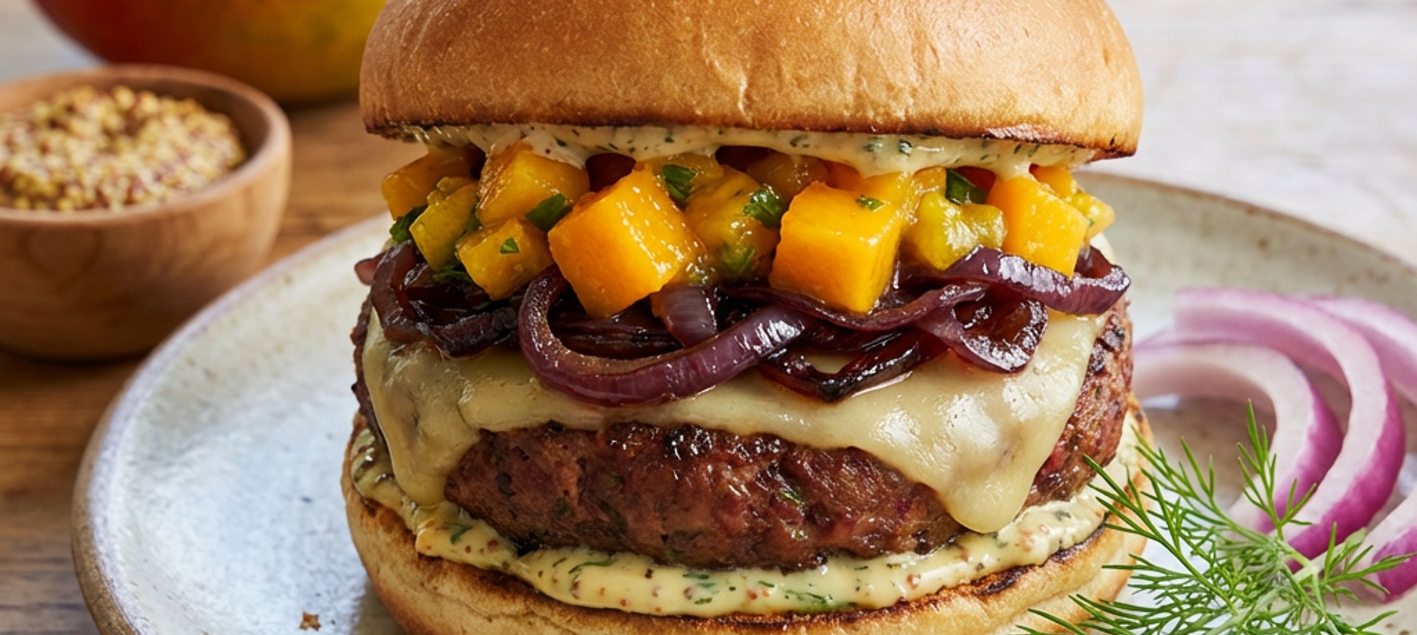 - 4Rozmražený ManaBurger griluj na rozpálenej pánvi, na grilu či v rozehřáté troubě, a to z obou stran 2 – 3 minuty. Pak na něj polož plátek sýra a nechej ho několik minut pod pokličkou rozpustit. Housku rozkroj a nasucho opeč. Spodní část housky potři koprovým dresinkem. Přidej listy hlávkového salátu a na ně polož burger se sýrem. Na sýr rozetři lžíci cibule a lžíci mangového dresinku. Přikryj horní polovinou housky a je hotovo. Dobrou chuť!