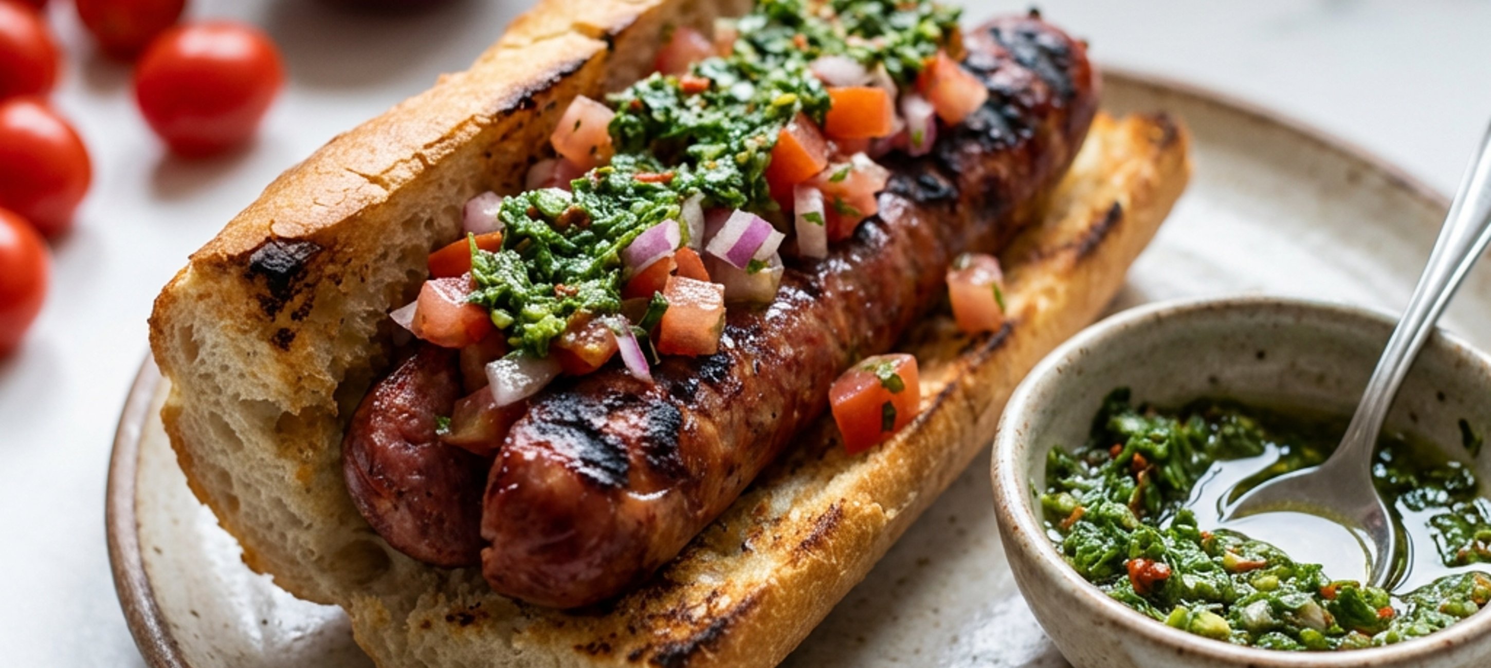 - 5Bagety podélně rozřízněte, dokud nebudou téměř proříznuté. Otevřete a grilujte řeznou stranou dolů 2 minuty. Chorizo rozdělte na bagety, navrch dejte chimichurri a rajčatovou směs.