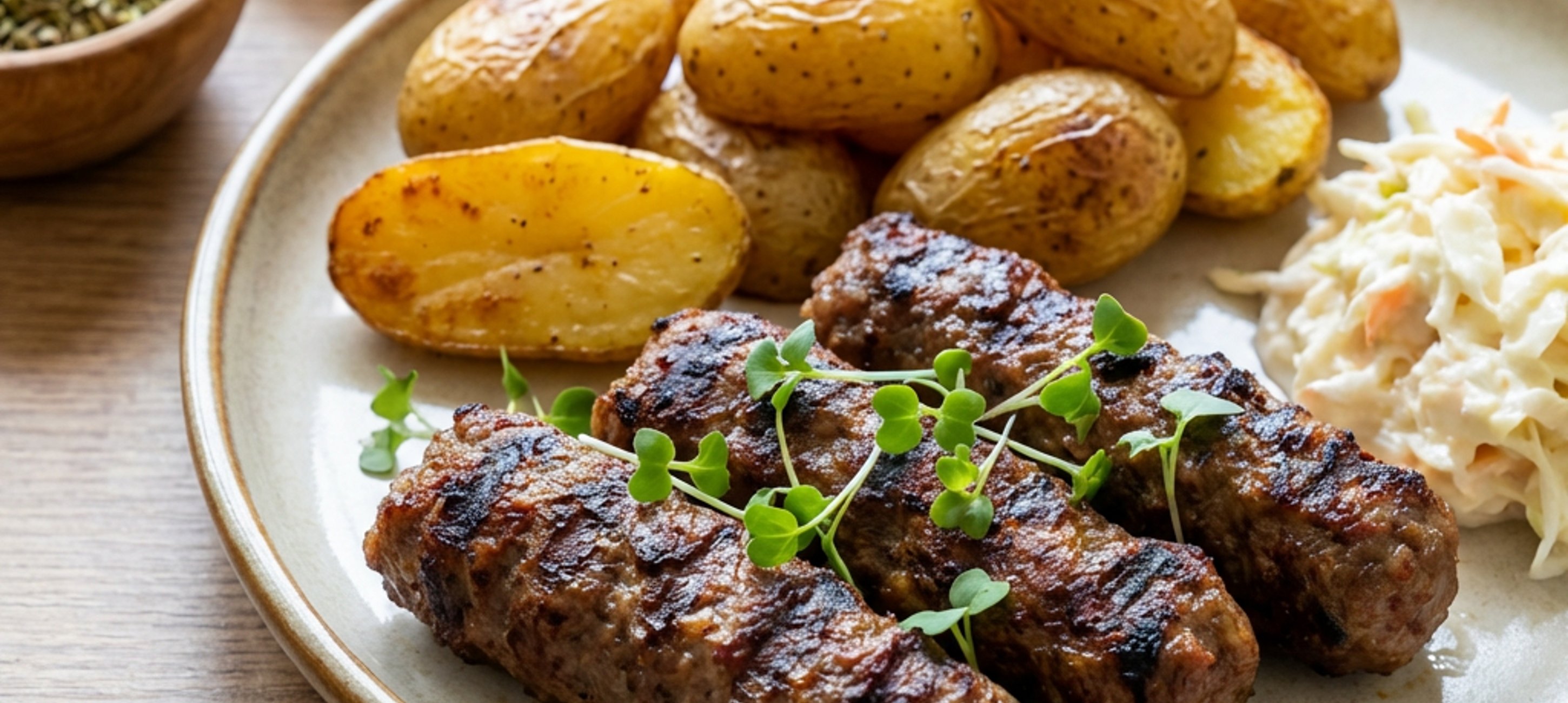- 4Čevabčiči můžeme podávat klasicky s vařenými brambory, cibulí a hořčicí nebo s pečenými bramborami ve slupce, mikrogreens a salátem Coleslaw.