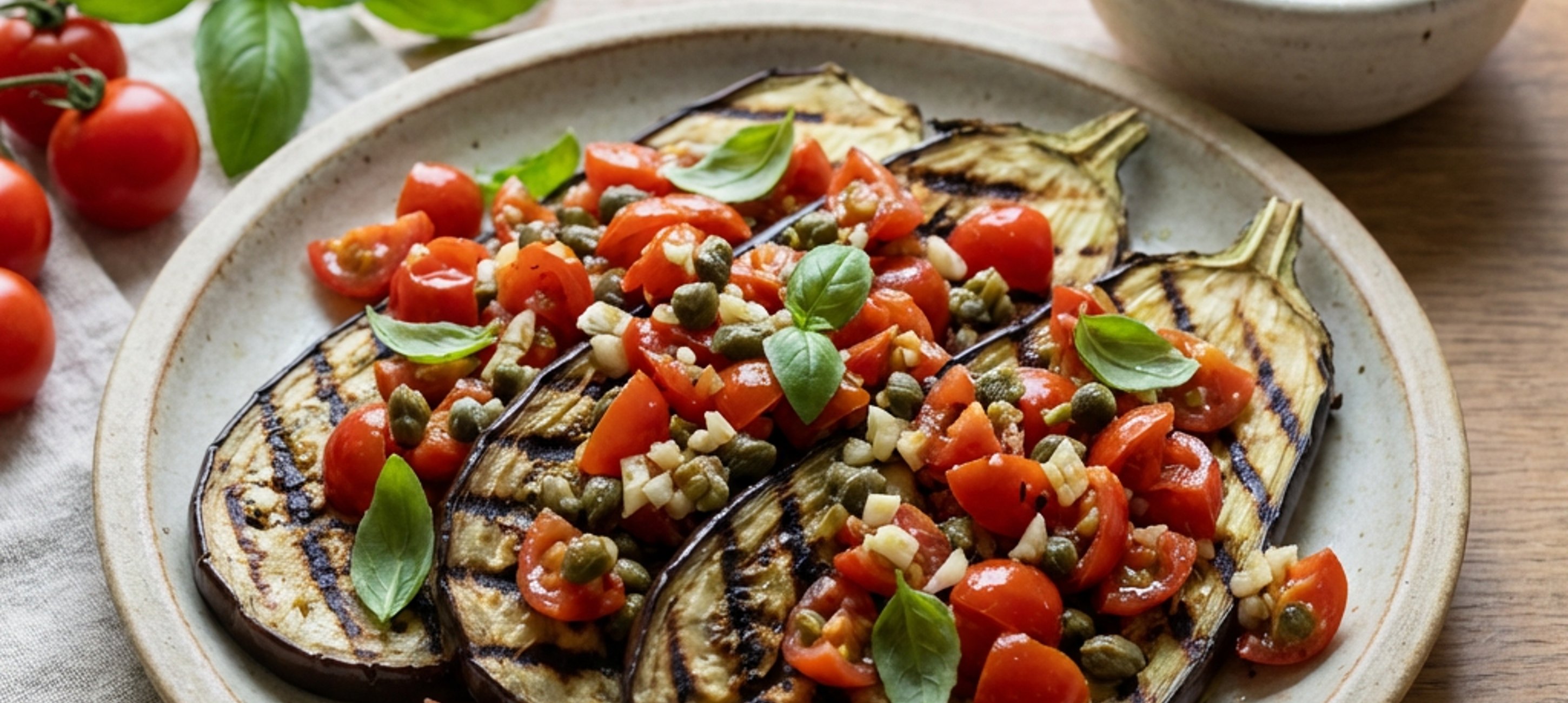 - 2Lilek omyjeme a osušíme. Nakrájíme jej na centimetrové plátky a pokapeme olejem. Gril rozpálíme na 230 °C. Poklademe na něj plátky lilku a grilujeme jej z každé strany 5 minut. Hotový lilek lehce osolíme a naservírujeme na talíř nebo tác. Na něj naneseme rajčatovou směs, přičemž dáváme pozor, abychom co nejvíce tekutiny z rajčat ponechali v misce. Celý pokrm zakápneme olivovým olejem a podáváme.