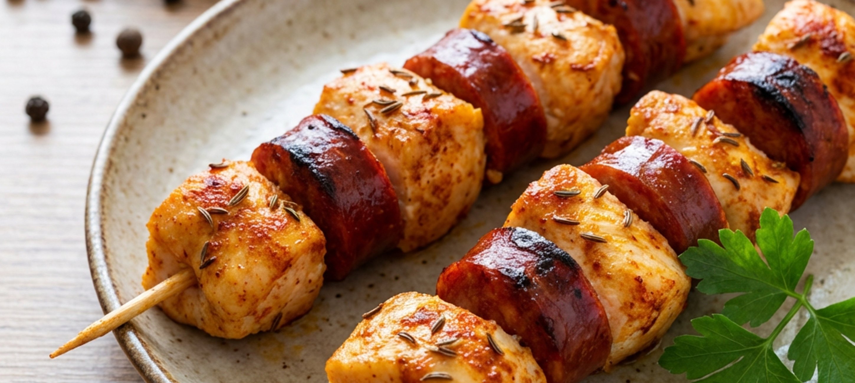 - 2Na špízovou jehlu střídavě napichujeme kousky masa a choriza. Vždy končíme kouskem masa. Gril rozpálíme na 230 °C a špízy ze všech stran opečeme. Maso bude až do středu propečené přibližně za 10 minut. Ověřit propečení můžeme na jednom kousku masa, které rozkrojíme. Pokud je maso uvnitř bílé, můžeme špízy z grilu stáhnout a podávat.