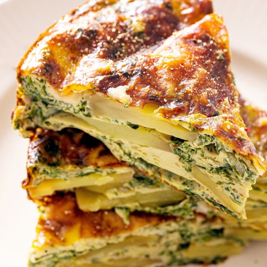 - 5Now, in the pan over high heat, heat another tablespoon of canola oil, add the sliced potatoes to the pan, and sauté them for 5–7 minutes over high heat. Then turn off the heat, pour your cheese and spinach mixture over the potatoes, transfer the entire pan to the preheated oven, and bake for 20–22 minutes at a temperature of 190–200 °C.